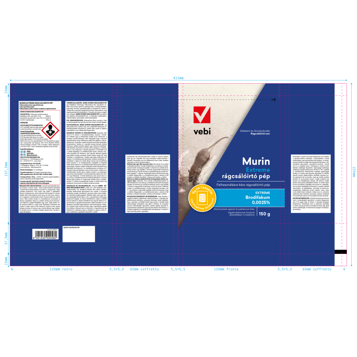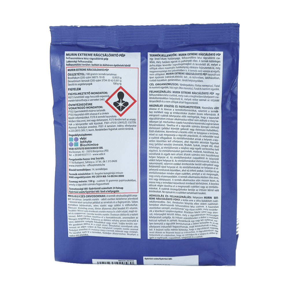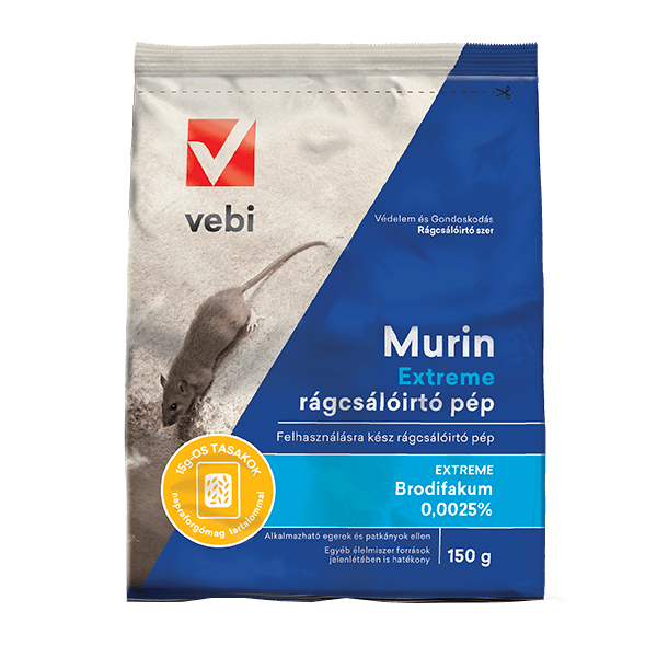 Azonnal használható, brodifakum hatóanyagú, kiemelkedő hatékonyságú egér és patkányirtó pép. Speciális, rágcsálók számára ellenállhatatlan illatú pép, mely egyéb élelmiszer források mellett is hatékony. Különlegesen puha, olajos keverék, mely napraforgómagból és kenderből áll. Elfogyasztása után, késleltetve (4-6 nap) fejti ki hatását, így minden rágcsáló fogyaszt belőle. Használata: helyezze a pépet a rágcsálók által bejárt útvonalra, majd alaposan mosson kezet. Ajánljuk az erre a célra kialakított műanyag csalétekállomásban elhelyezni. Így elhelyezve kül- és beltéren egyaránt használható. Gyermekek elől elzárandó! Háziállatok számára nem elérhető helyen használandó! Kerülje a bőrrel való érintkezést.