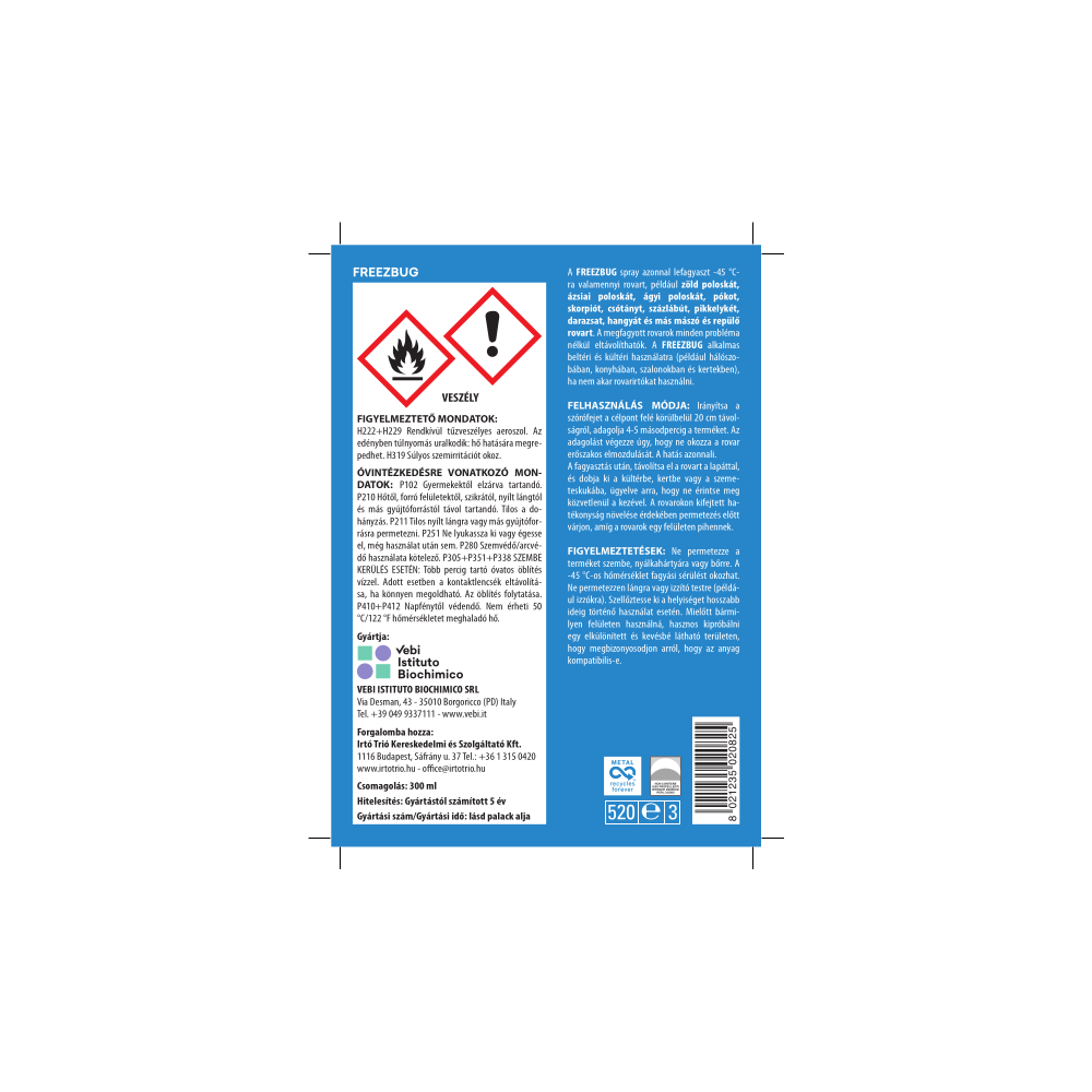 Teljesen vegyszermentes fagyasztó spray, vásárlóink kedvence, mely azonnal lefagyaszt -45°C-ra valamennyi rovart. Extra hatásfokú, a fagyasztást követően a rovarok azonnal eltávolíthatók, a fagyás végzetes a rovarokra. Használata: irányítsa a szórófejet a célpont felé körülbelül 20 cm-es távolságra, majd tartsa nyomva 4-5 másodpercig. Az adagolás akkor megfelelő, ha a rovart éri, de nem elmozdítja. Kül- és beltéren egyaránt használható. Javasolt hálószobában, gyerekszobában, szalonokban, kertekben alkalmazni, mászó- és repülőrovarok ellen.
