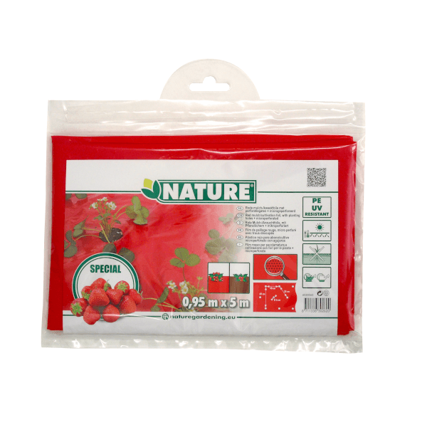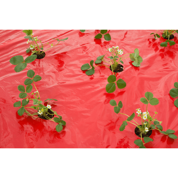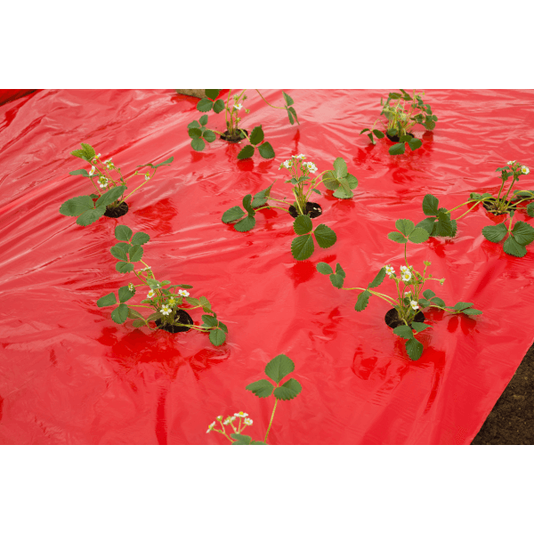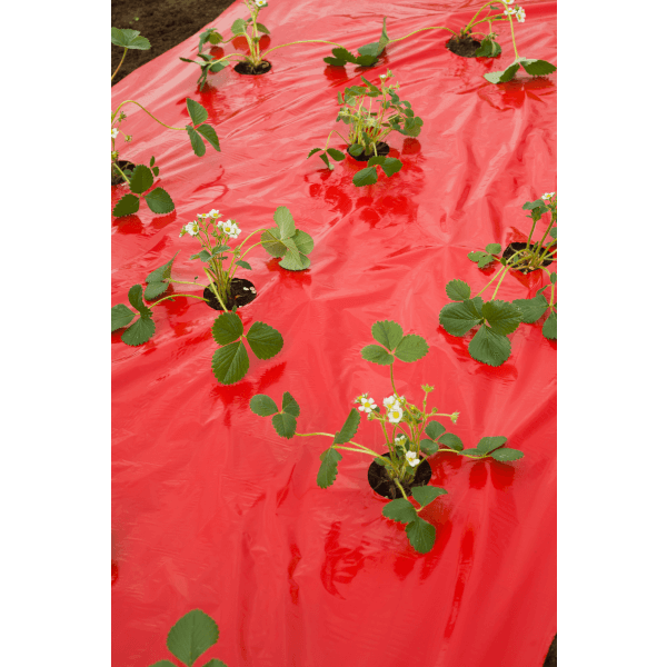 Piros színű takarófólia eper telepítéséhez, Gyárilag elő perforált. 25 mikronos vastagságban. Számos kísérlet igazolja, a talajtakaró fóliák alkalmazásának az irodalom által említett legfőbb előnyét, a talajfelmelegítő hatást. Az összes talajtakaró fólia szignifikánsan növelte a talaj hőmérsékletét 10 cm-es mélységben a takaratlan kezeléshez képest, valamint szintén a takaratlan kezeléssel összehasonlítva a termésmennyiséget kb. 20%-kal. A tenyészidő folyamán hosszabb ideig biztosított a fóliás takarás optimális hőmérsékletet a talajban az eper számára.
