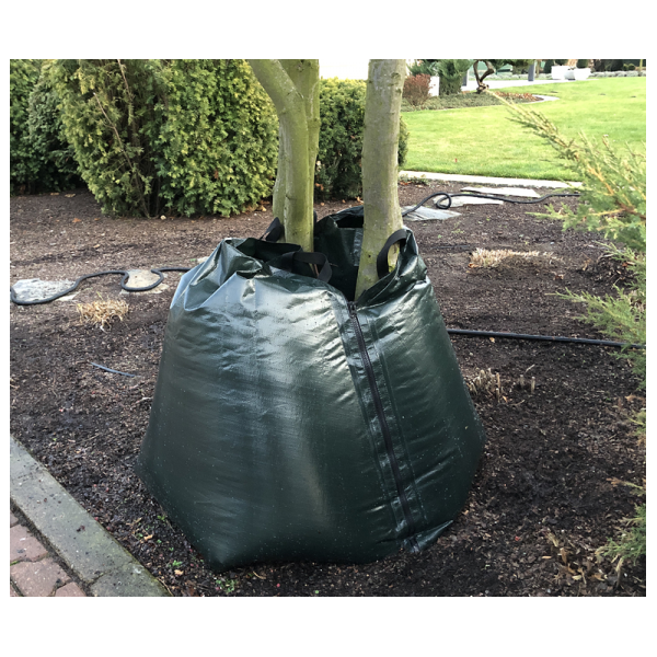 A zsákból való csöpögés körülbelül 5 órát vesz igénybe. Frissen ültetett fák öntözése 18 cm-es átmérőig. A cseppöntözési módszernek köszönhetően a növények körül a föld lassan itatódik át az öntözővízzel, és a víz a talaj mélyebb rétegeibe is eljut. Fogantyúkkal és cipzárral felszerelt, biztosítja a gyökérzóna vízzel való telítettségét. A precíziós öntözés csökkenti a gombás betegségek előfordulását. A vízmegtakarítás több mint 65% lehet a hagyományos öntözési módhoz képest. Nagyobb fatörzskerület esetén két zsák összekapcsolásának lehetősége. Több évszakos termék több évnyi öntözést tesz lehetővé egyetlen zsákkal.
