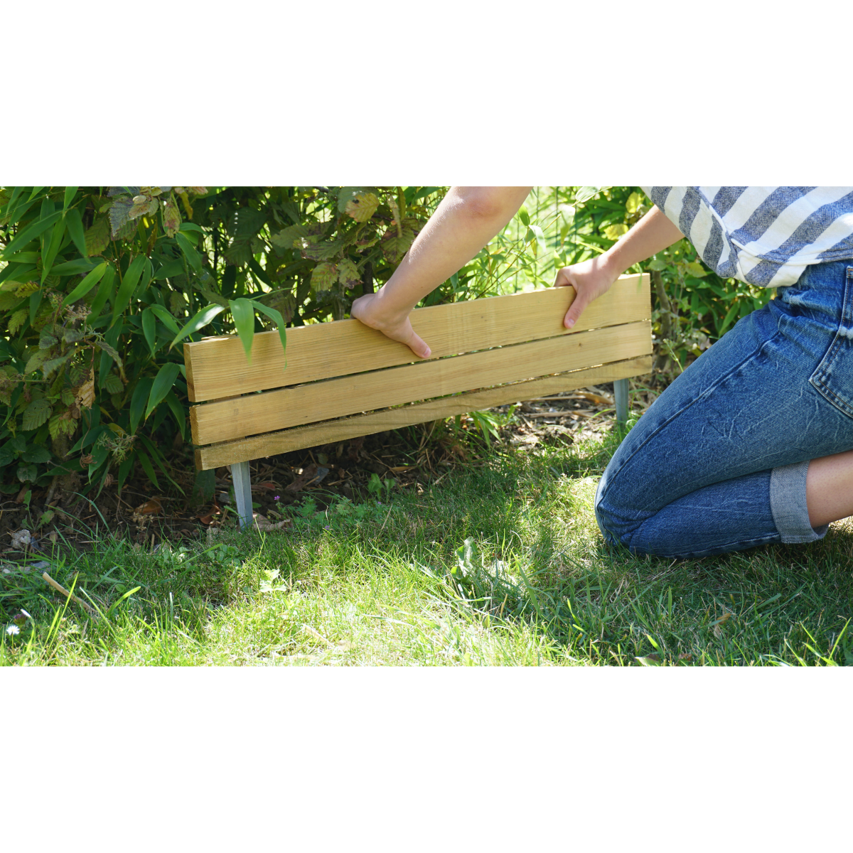 A Hakea Th15 ágyásszegély természetes erdei fenyőből készült, zöld autoklávos felületkezeléssel, amely hatékonyan védi a fát a nedvesség, gombák és kártevők ellen. A beépített fém lábak megakadályozzák a felszálló nedvesség hatását, így növelik az élettartamot. A szegély leszúrható kivitelben készült, ami gyors és egyszerű telepítést tesz lehetővé, akár ágyások, sétányok vagy gyephatárok mentén.