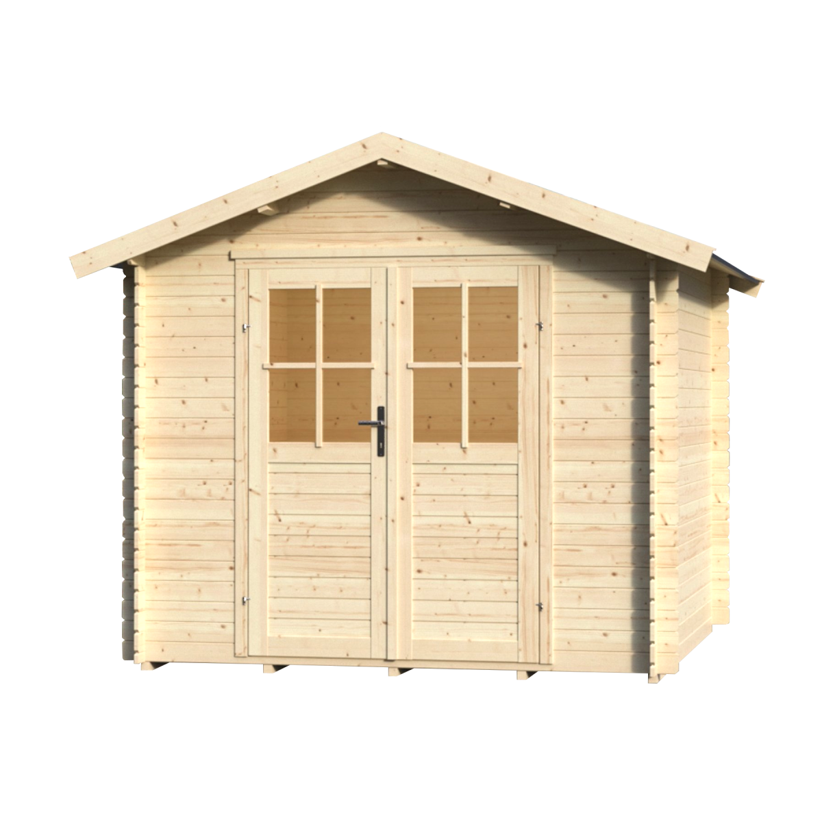 Közepes méretű szerszámtároló faház boronafalas szerkezettel. Kiváló választás ha a kert karbantartásához szükséges szerszámokat az időjárás károsító hatásaival szemben védett helyen szeretné tárolni. Natúr lucfenyőből készült, ami természetes hatást keltve kiválóan beilleszkedik a kert összképébe. Alapterülete 5.3 m2. Mérete (külső fal síkja): 230 cm x 230 cm. Falvastagság: 18 mm. Gerincmagasság: 225 cm. Oldalmagasság: 184 cm. A kétszárnyú ajtóban helyet foglaló 2 db 2 mm-es plexi lap gondoskodik a faházba bejutó természetes fényről. Az ajtó mérete (átjárhatósági méret): 170 cm x 128.2 cm. Az összeszereléshez szükséges kötőanyagok, zárak, vasalatok az egységcsomagban megtalálhatók. A faházat fedő nyeregtetőhöz nincs tetőborító anyag, így mérsékelten vízálló. Tetőkinyúlás: előre: 21 cm, jobb oldalra: 26 cm, bal oldalra: 26 cm, hátra: 9 cm. Javasolt alapozási méret: 250 cm x 250 cm.