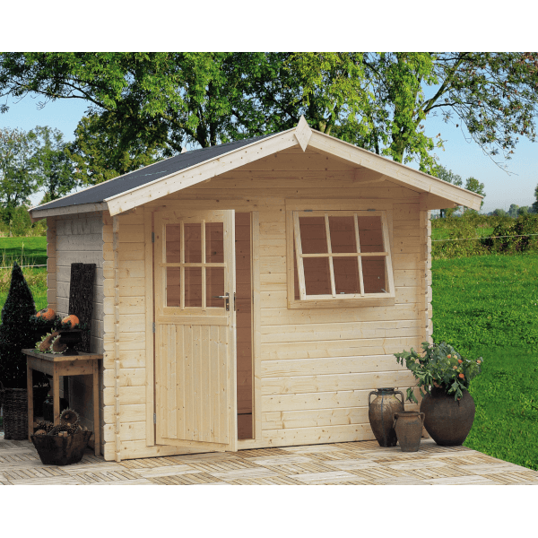 Kerti faház boronafalas szerkezettel, anyaga natúr lucfenyő, egyszárnyú ajtóval, bukó ablakkal, a nyílászáróban 2mm-es plexivel, padlóval, a tető és padlódeszkák nút-féderes illesztéssel 15mm vastagságúak, padlózat alatt kb. 60cm-ként impregnált párnafa alátámasztás, tetőn kátránypapír borítás. Összeszereléshez szükséges kötőanyagok, zárak vasalatok az egységcsomagban. Falvastagság: 28mm, gerinc magasság: 232cm, oldalmagasság: 195cm. Mérete (fal külső síkja): 250x250cm, ablak mérete (nyílásméret): 69x79cm, ajtó mérete (átjárhatóság): 174x79cm.