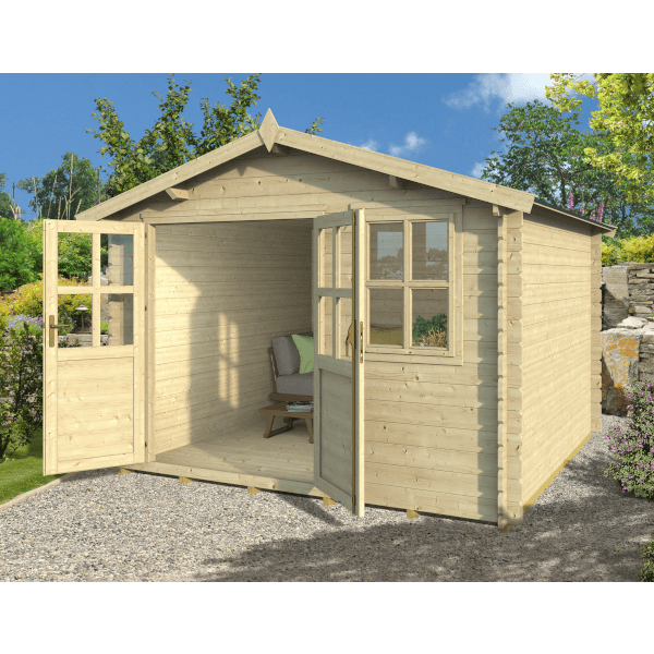 Kerti szerszámtároló faház boronafalas szerkezettel, anyaga natúr lucfenyő, kétszárnyú ajtóval, nyíló ablakkal, a nyílászáróban 2mm-es üveggel, padlóval, a tető és padlódeszkák nút-féderes illesztéssel 15mm vastagságúak, padlózat alatt kb. 60cm-ként impregnált párnafa alátámasztás, tetőn kátránypapír borítás. Összeszereléshez szükséges kötőanyagok, zárak vasalatok az egységcsomagban. Falvastagság: 28mm, gerinc magasság: 243cm, oldalmagasság: 195cm. Mérete (fal külső síkja): 300x300cm, ajtó mérete (átjárhatóság): 175x138cm, ablak mérete: 83x59cm.