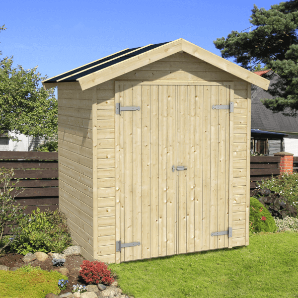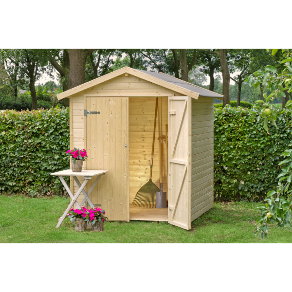 Kerti szerszámtároló faház paneles szerkezettel, anyaga natúr lucfenyő, kétszárnyú ajtóval, padlóval, a tető és padlódeszkák nút-féderes illesztéssel 15 mm vastagságúak, padlózat alatt kb. 60 cm-ként impregnált párnafa alátámasztás, tetőn kátránypapír borítás. Összeszereléshez szükséges kötőanyagok, zárak vasalatok az egységcsomagban. Falvastagság: 13,5 mm, alapterület: 2,04m2, tető mérete: 2,88m2, tetőgerinc magasság: 220cm, oldalfal magasság: 182cm, javasolt alapozási méret: 180x130cm. Mérete (fal külső síkja): 170x120cm, kétszárnyú ajtó mérete (átjárhatóság): 175x120cm, tetőkinyúlási méretek: előre: 10cm, oldalra (jobb, bal): 15-15cm, hátra: 6,5cm, tetőn 12mm vastag OSB lap.