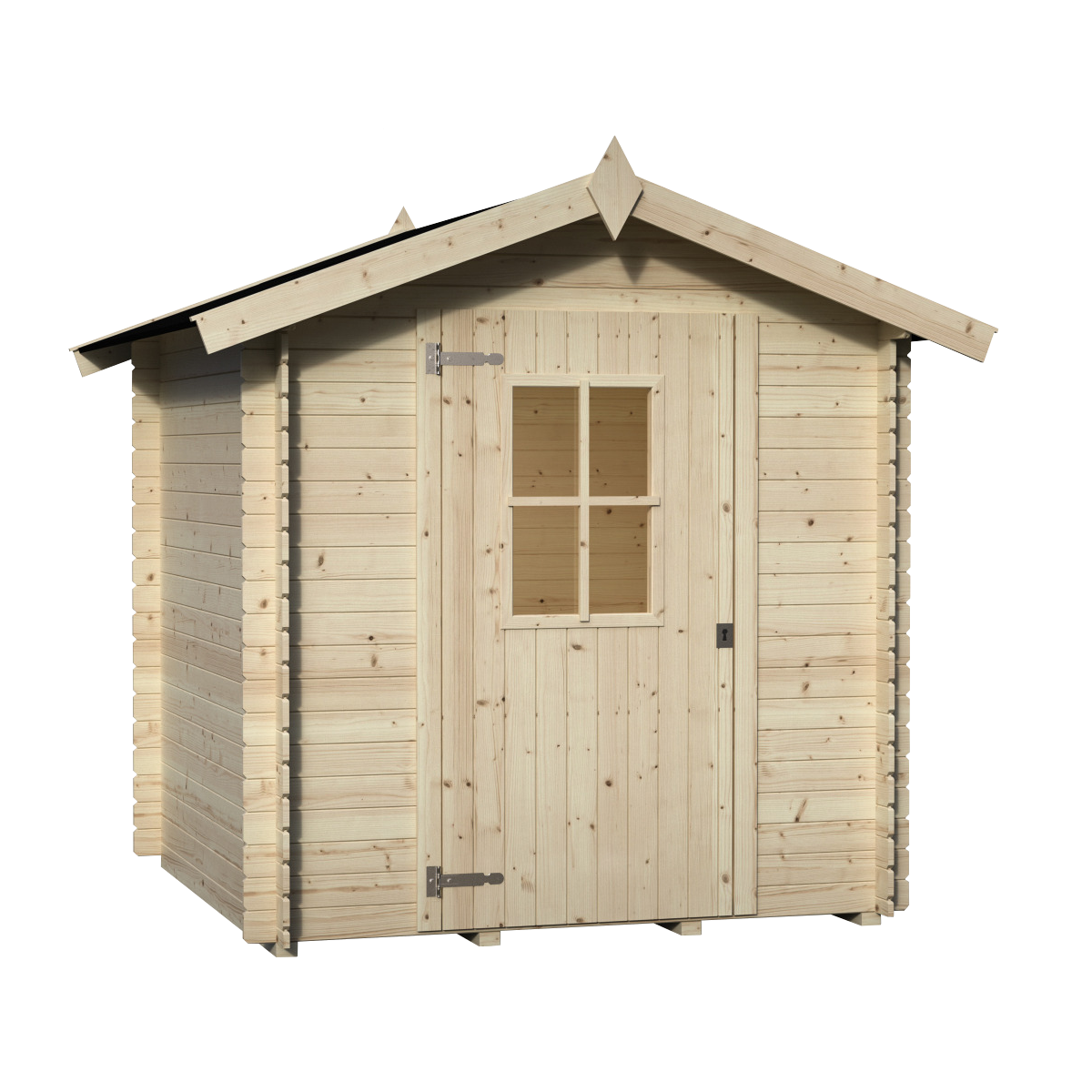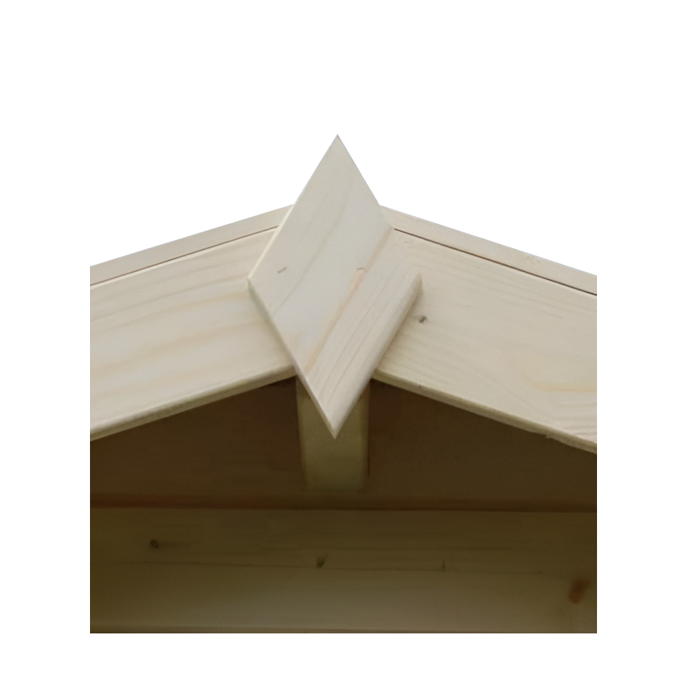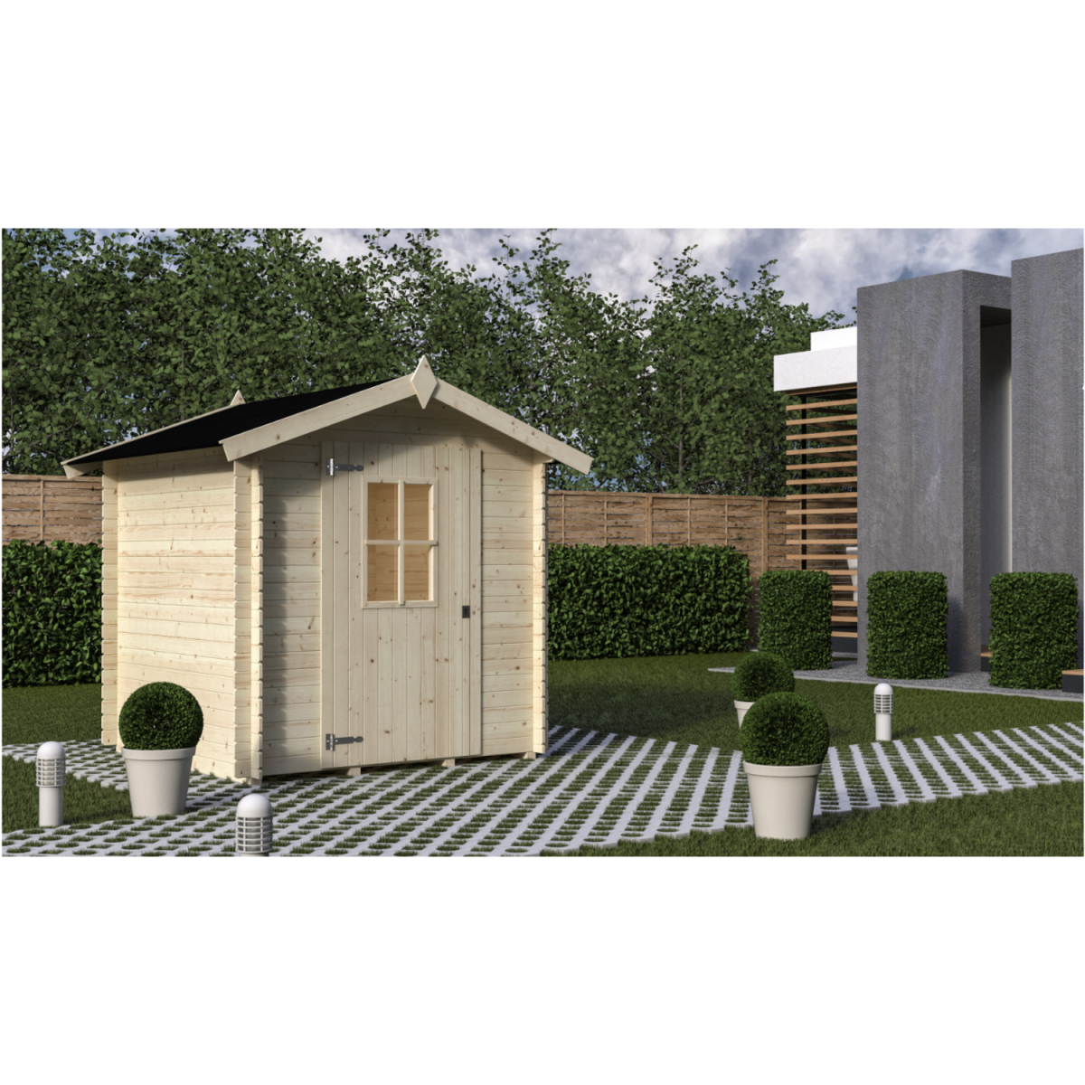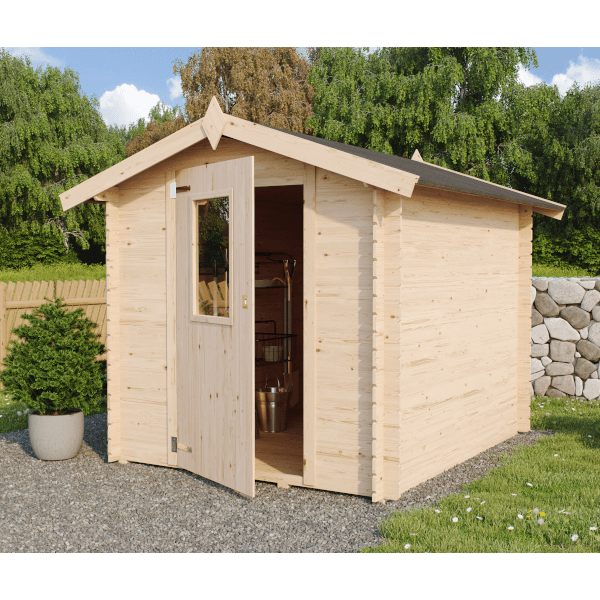 Közepes méretű szerszámtároló faház boronafalas szerkezettel. Ideális megoldás ha a kerti szerszámokat egy helyen szeretné tárolni és megóvni az időjárás viszontagságaitól. Natúr lucfenyőből készült, ami természetes hatást keltve kiválóan beilleszkedik a kert összképébe. Az egyszárnyú ajtóban helyet foglaló 2 mm-es plexi lap gondoskodik a faházba bejutó természetes fényről. A tető- és padlódeszkák 15 mm vastagok, nút-féderes illesztésűek. A padlózat alatti kb. 60 cm távolságban impregnált párnafa alátámasztás biztosítja a szerszámtároló stabilitását. A nyeregtető kátránypapír borítása vízlepergető tulajdonságú, így az esővel szemben is védett marad. Az összeszereléshez szükséges kötőanyagok, zárak, vasalatok az egységcsomagban megtalálhatók. Falvastagság: 18 mm. Gerincmagasság: 209 cm. Oldalmagasság: 175 cm. A faház mérete (fal külső síkja): 180 cm x 180 cm. Az ajtó mérete (átjárhatóság): 165 cm x 86 cm.
