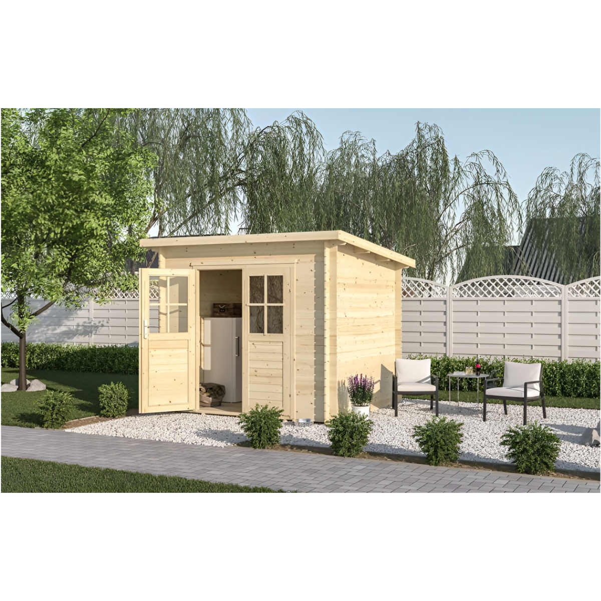 Közepes méretű szerszámtároló faház boronafalas szerkezettel. Ideális megoldás ha a kerti szerszámokat egy helyen szeretné tárolni és megóvni az időjárás viszontagságaitól. Natúr lucfenyőből készült, ami természetes hatást keltve kiválóan beilleszkedik a kert összképébe. A kétszárnyú ajtóban helyet foglaló 2 db 2 mm-es plexi lap gondoskodik a faházba bejutó természetes fényről. A tető- és padlódeszkák 15 mm vastagok, nút-féderes illesztésűek. A padlózat alatti kb. 60 cm távolságban impregnált párnafa alátámasztás biztosítja a szerszámtároló stabilitását. A nyeregtető kátránypapír borítása vízlepergető tulajdonságú, így az esővel szemben is védett marad. Az összeszereléshez szükséges kötőanyagok, zárak, vasalatok az egységcsomagban megtalálhatók. A hozzátartozó melléképület a 333239-es cikkszámon érhető el. Falvastagság: 18 mm. Előfal magasság: 213 cm. Hátfal magasság: 198 cm. A faház mérete (fal külső síkja): 230 cm x 200 cm. Ajtó mérete (átjárhatóság): 170 cm x 128 cm.