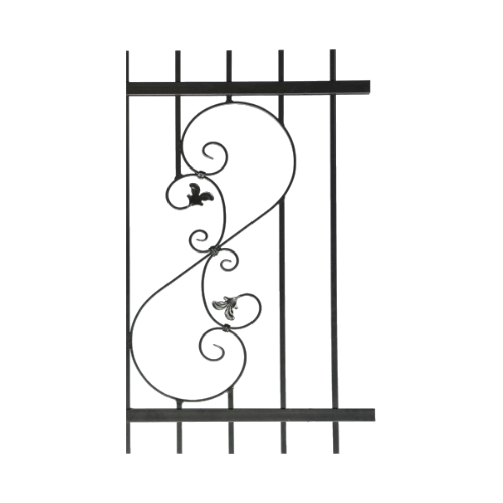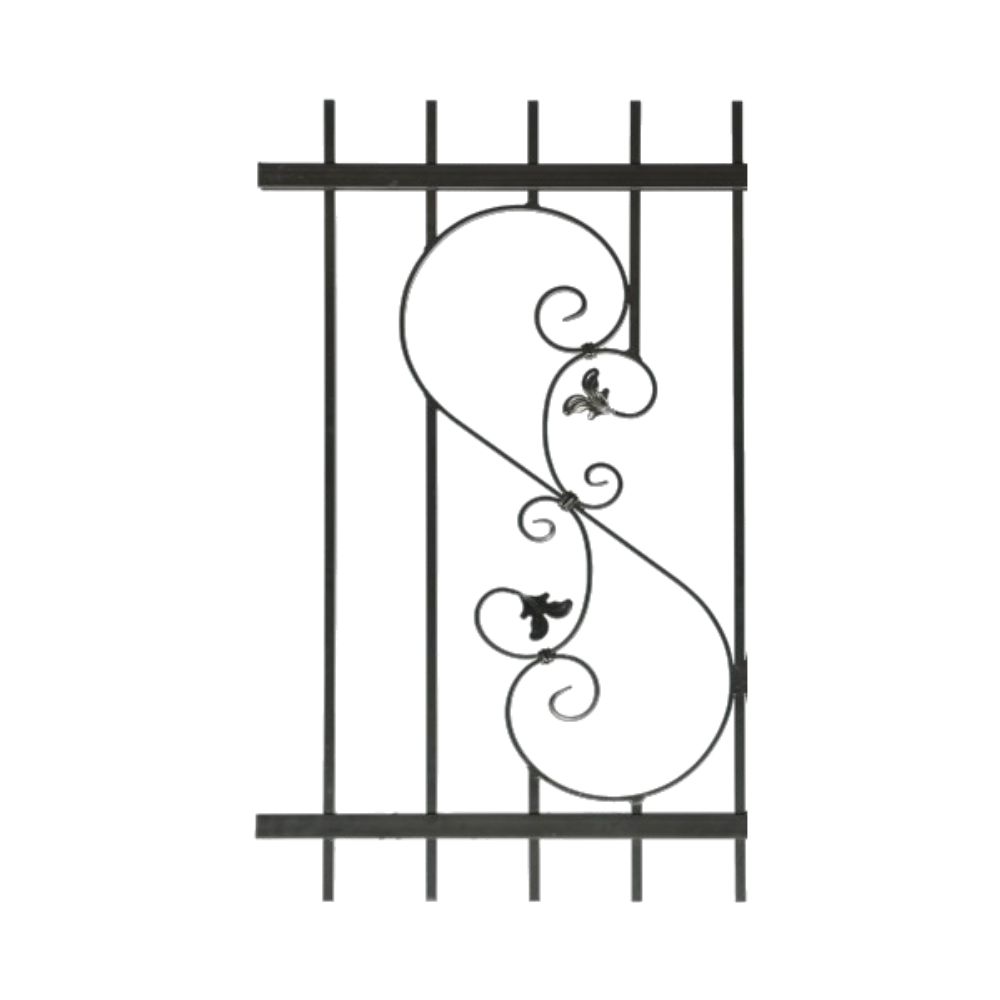 Elma ablakrács sima fekete színben, mely masszív és időtálló. A tűzi horganyzott és színterezett elemek különlegesen hosszú védelmi időtartamot biztosítanak a korróziós hatások ellen. Esztétikus és biztonságos. A hegesztési pontok rejtve vannak, így nem romlik az esztétikája. A négyzetvas teljes felületen kapcsolódik a laposvashoz, amely kívülről nem látszik. A csúcsdíszek hegesztve vannak, nem eltávolíthatók. Minden elem egyedi méretre szabható, az alakíthatóság a felfogató zsanérok állításával, valamint az elemek vágásával módosítható. Elma motívum Kovácsolt jellegű fém méretre alakítható kerítéselem.