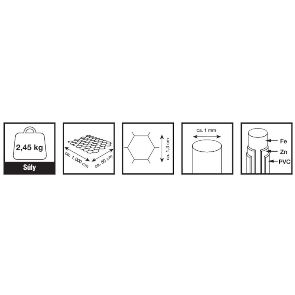 Hatszögletű fonatolt huzalháló PVC bevonattal, 1000x50 cm méretben; huzal átmérő: 1mm; fonatok magassága kb.1,3cm.
