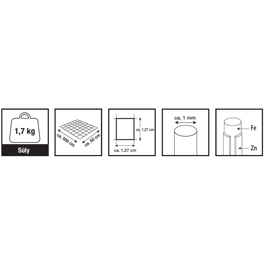 Hegesztett háló horganyzott bevonattal, 500x50 cm méretben; huzal átmérő: 1 mm; fonatok magassága/szélessége: kb. 1,27 cm.