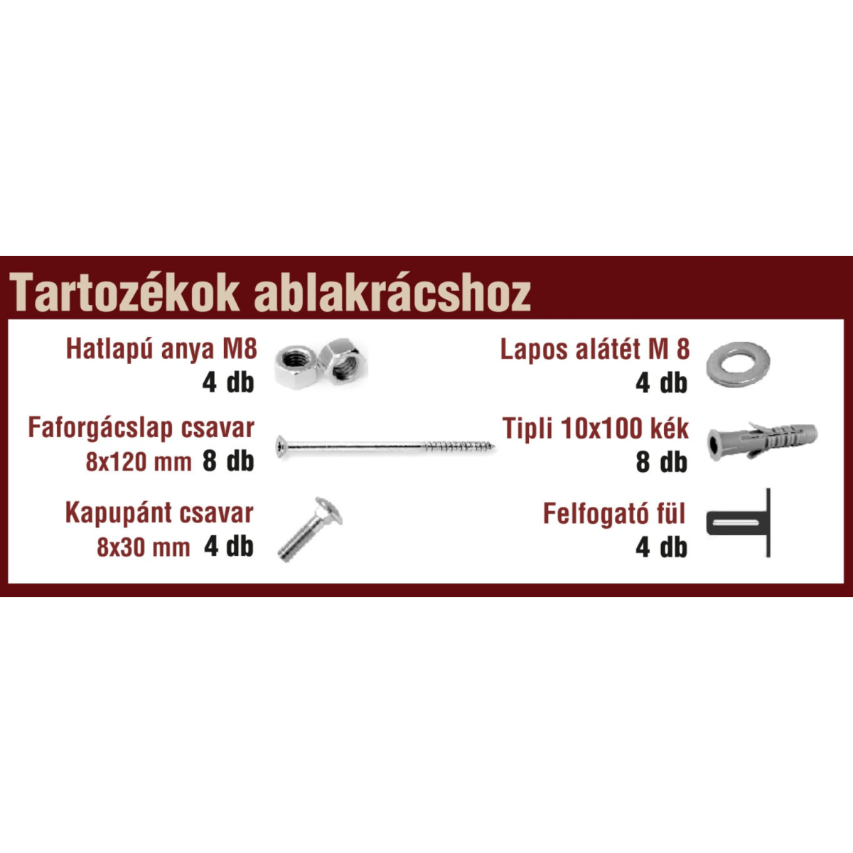 A doboz tartalma: 4 db hatlapú M 8 anya, 4 db M 8 lapos alátét, 8 db 8x120 mm-es faforgácslap csavar, 4 db 8x30 mm-es kapupánt csavar, 8 db 10x100-as tipli, 4 db felfogató fül.