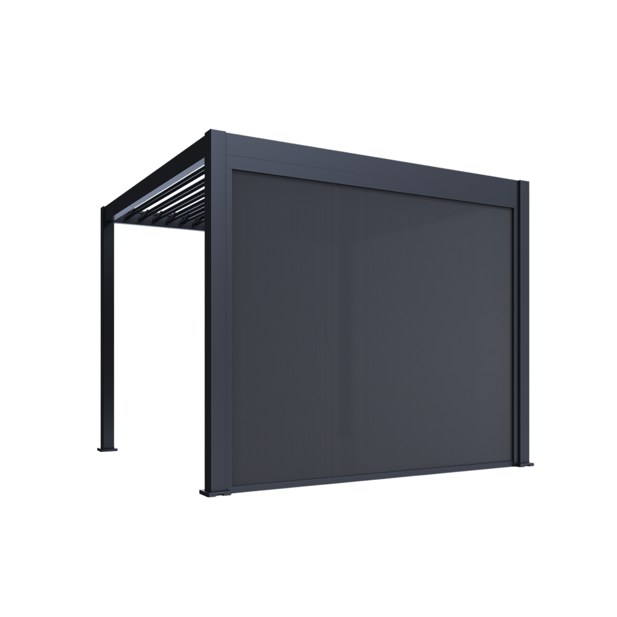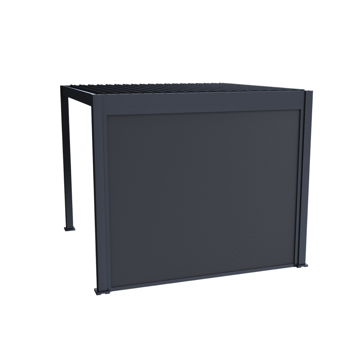 Pergola oldalára szerelhető textil roló. Ez az árnyékoló tökéletes választás a 3x3 méteres bioklimatikus pergolák hosszanti oldalának lefedésére. A sötétszürke, időjárásálló textil maximális védelmet nyújt a közvetlen napsütés ellen, miközben kellemes privát teret alakít ki a kertben vagy a teraszon.