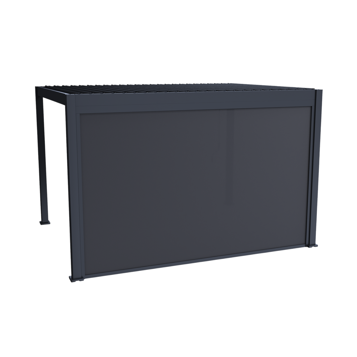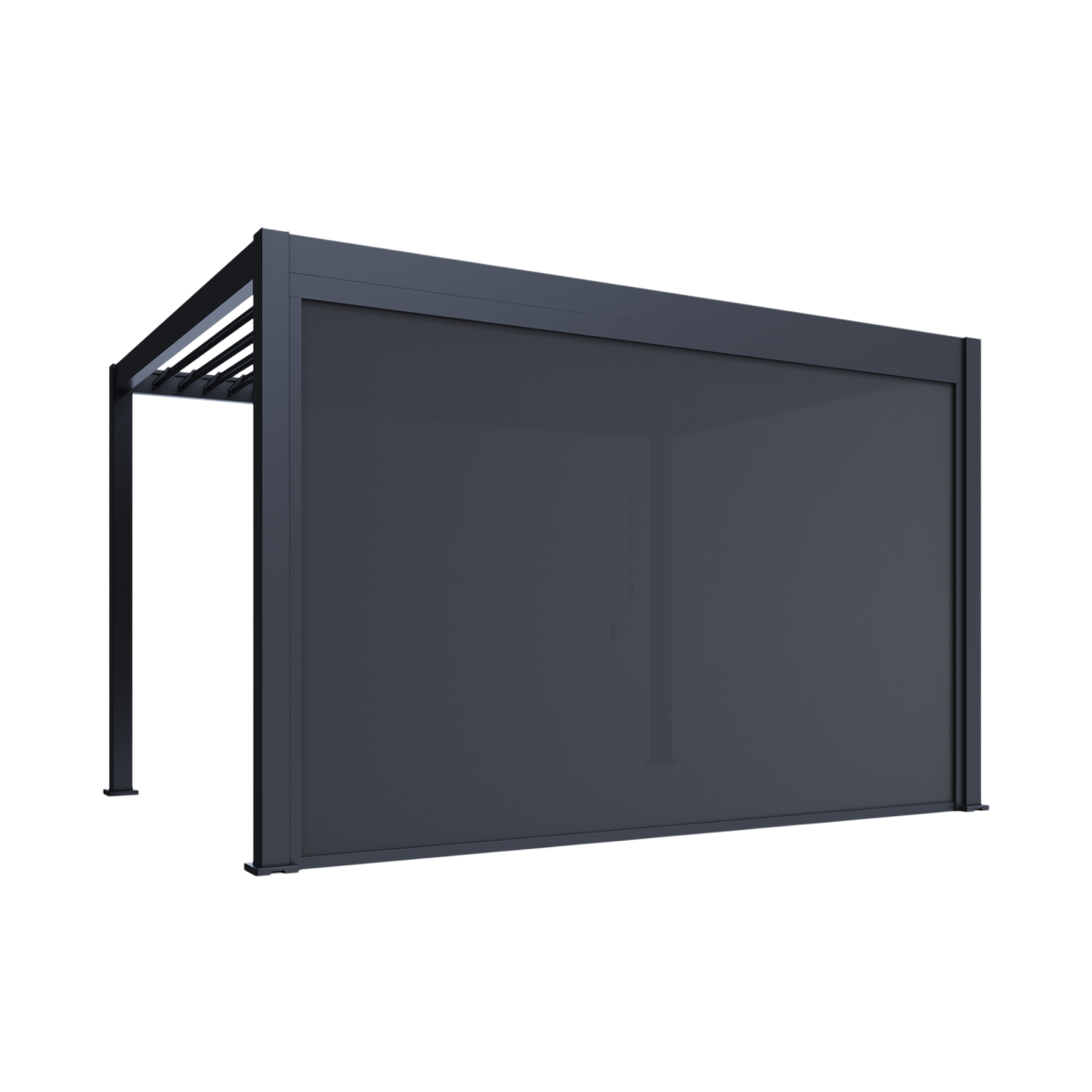 Pergola oldalára szerelhető textil roló. Ez az árnyékoló tökéletes választás a 3x4 méteres bioklimatikus pergolák hosszanti oldalának lefedésére. A sötétszürke, időjárásálló textil maximális védelmet nyújt a közvetlen napsütés ellen, miközben kellemes privát teret alakít ki a kertben vagy a teraszon.