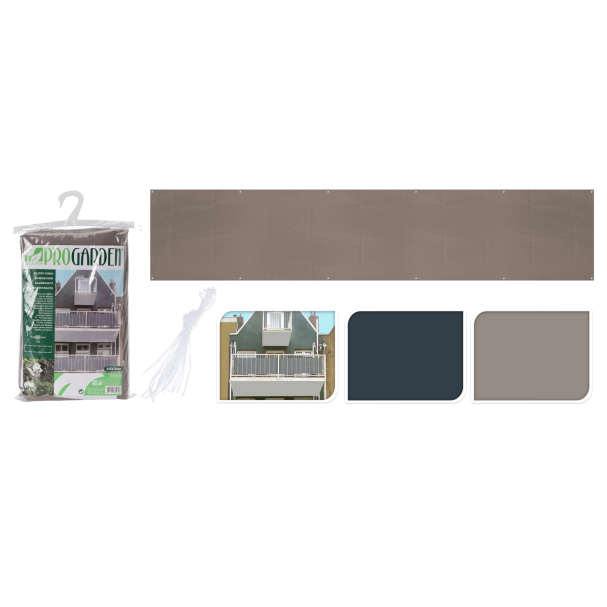 Balkon védő anyag, 240gr/m2, UV álló anyag, víztaszító. Mérete: 76x445cm, 12 alumínium fűzőkarika, a kötél hossza 70 cm, 2 féle szinben kapható, grafit és homok.