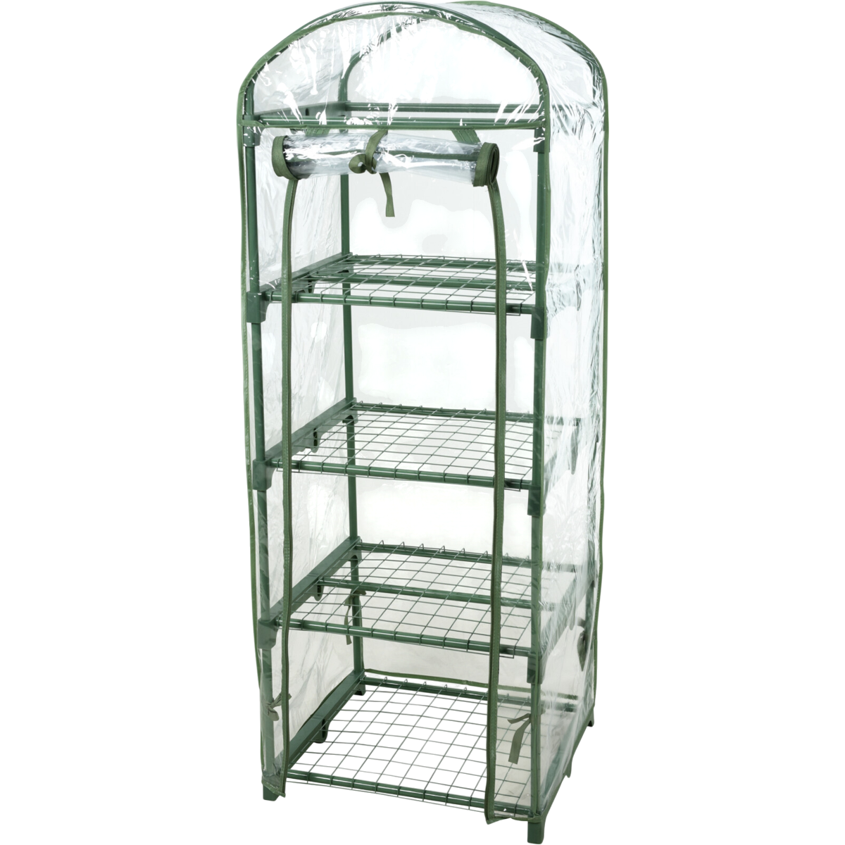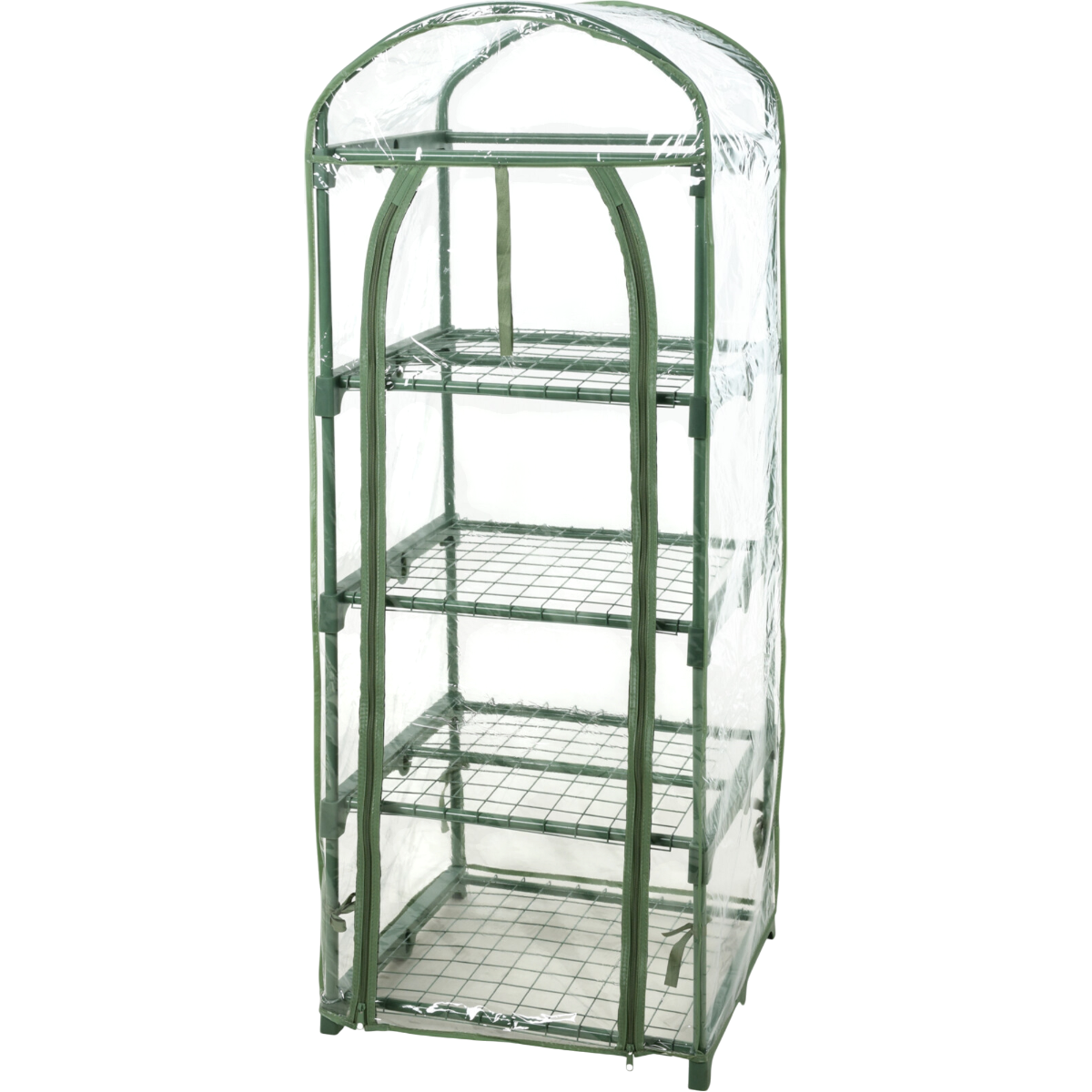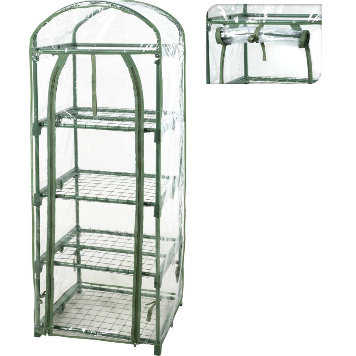 Az átlátszó PVC borítás segít megtartani a növények számára kedvező hőmérsékletet és páratartalmat, míg a zöld színű porbevonattal ellátott fém váz stabil tartást biztosít.