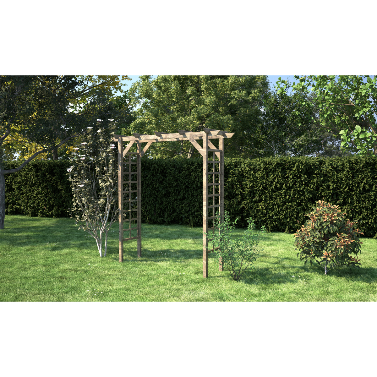 Fa szerkezetével és modern dizájnjával ez a boltív klasszikus, de mégis modern hangulatot kölcsönöz kertjének. A két oldalsó rács bőséges helyet biztosít egy sor növény bemutatásához, illatos és lenyűgöző átjárót teremtve. Az ív nagy magassága lehetővé teszi a könnyű áthaladást még a legmagasabbak számára is. A lábak visszavághatók a magasság beállításához, így könnyedén létrehozhatja kertje tökéletes megjelenését. Élvezze kertjét egész évben ezzel a pergolával, melyet akár le is festhetünk, ha úgy jobban tetszik.