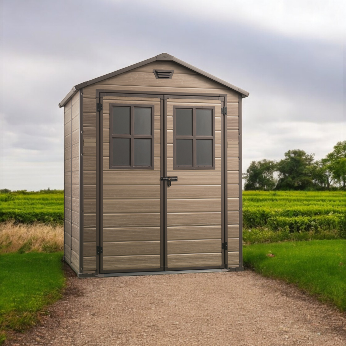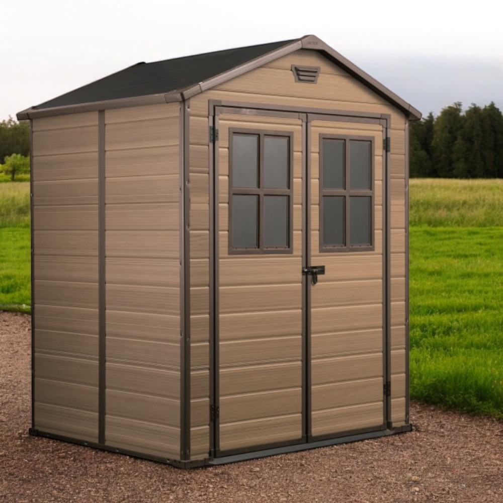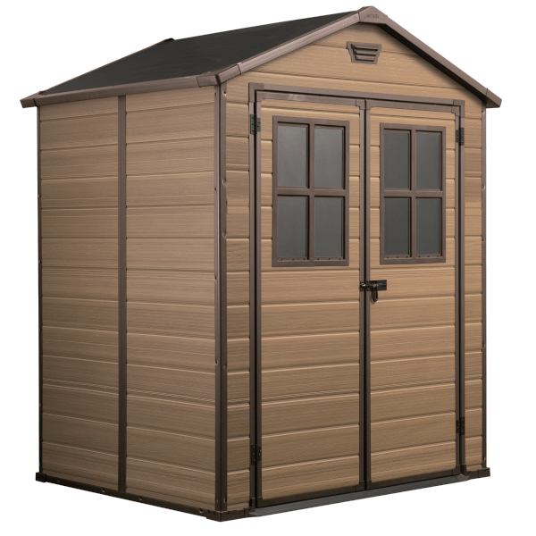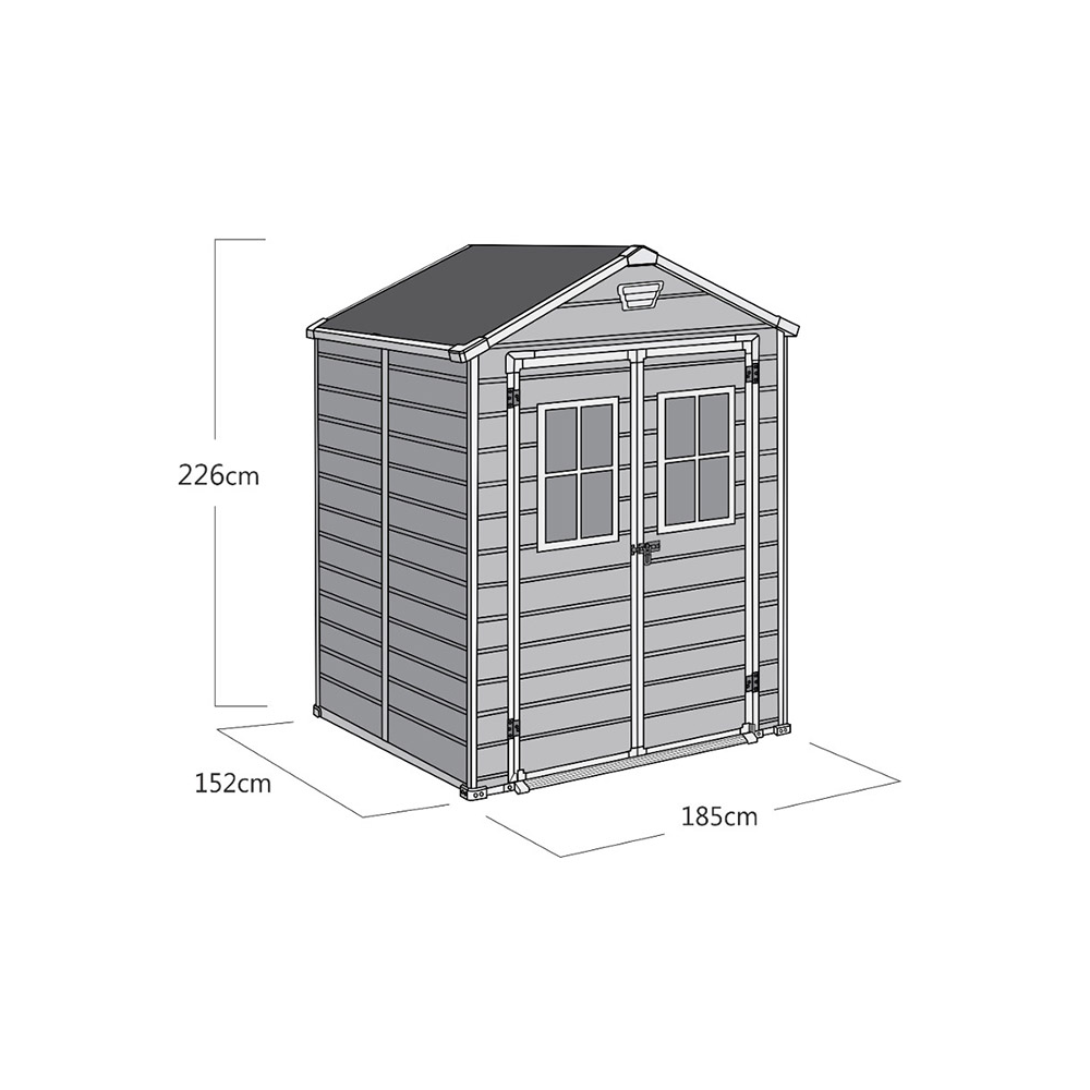 A Scala 6x5 kerti ház a praktikus és stílusos megoldásokat kereső felhasználók igényeire jelent megoldást. A magas minőségű anyagokból készült tető és falak ellenállnak az időjárás viszontagságainak, a nedvességnek és a mechanikus sérüléseknek. A nagy belső tér különböző mindenféle kerti szerszám és tartozék tárolására alkalmas. A tér belseje tovább alakítható polcok, kampók és akasztók rögzítésével. A felületkialakítást rusztikus stílus jellemzi.