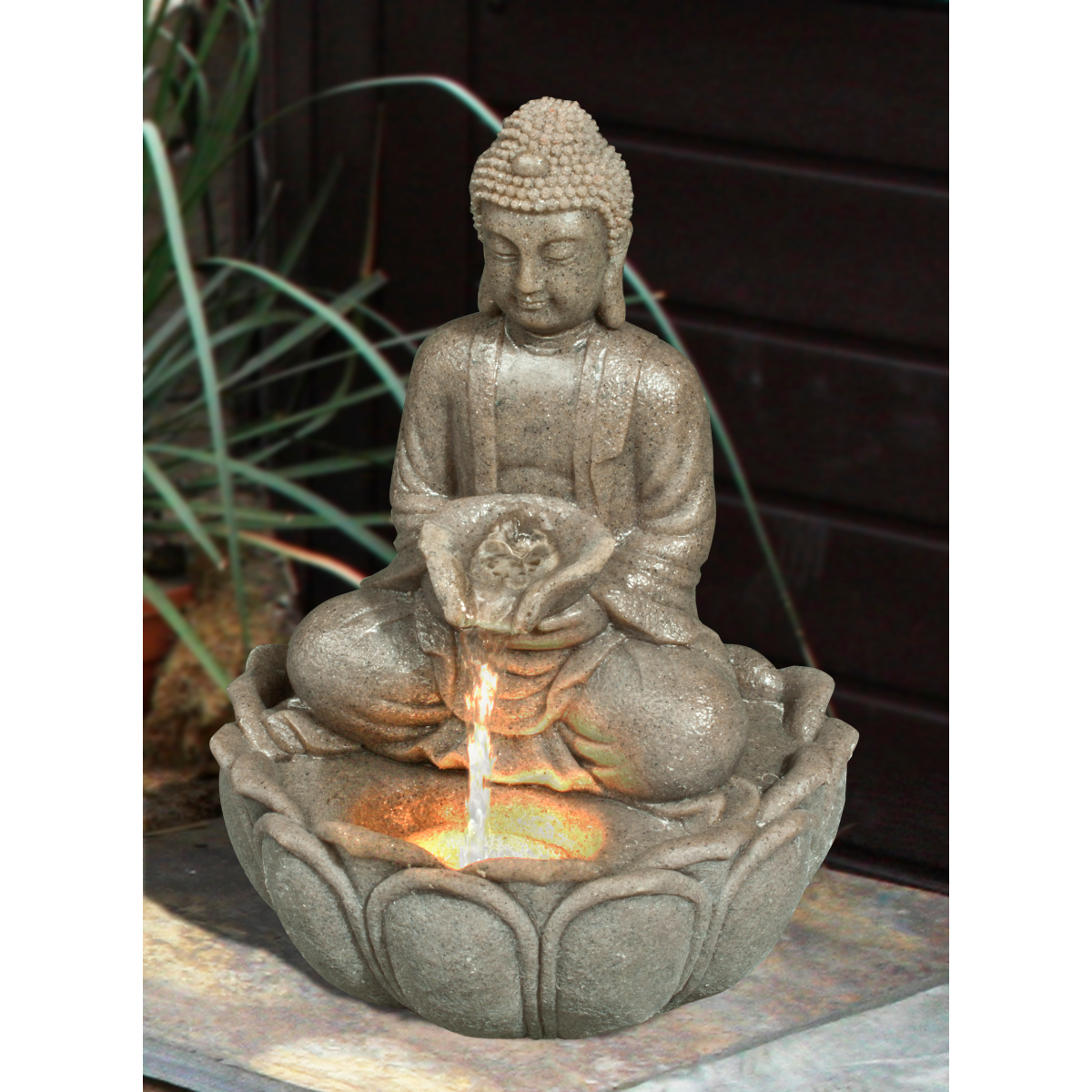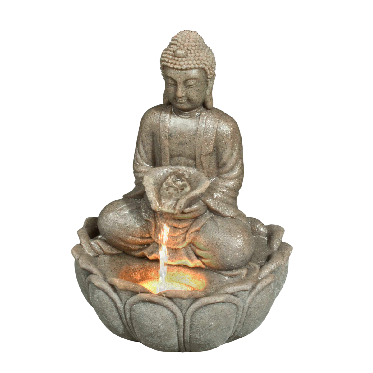 A szökőkút meditáló Buddha figurát ábrázol, keresztbe tett lábakkal, kezében egy tálkával, amelyből a víz lefelé csordogál. Az alsó rész lótuszvirág formájú medence, amely harmonikusan fogadja a lefolyó vizet. Az egész kompozíció kiegyensúlyozott, szimmetrikus, spirituális hangulatot áraszt.