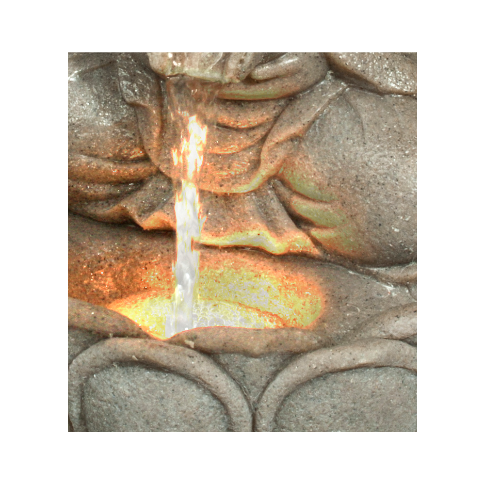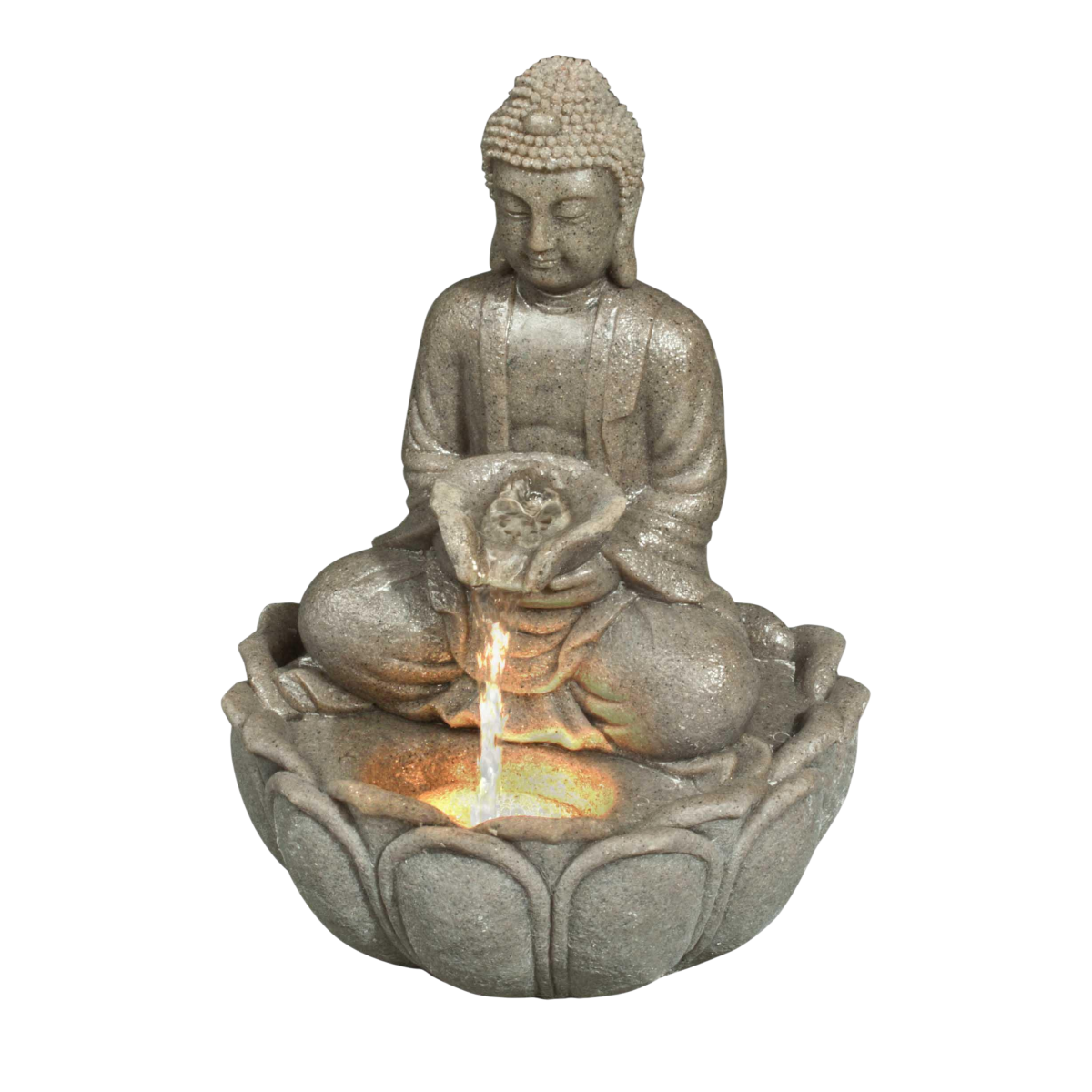 A 25 × 18 × 34 cm-es LED-es kerti szökőkút különleges, nyugalmat sugárzó megjelenésével igazi hangulati elem lehet kertben, teraszon vagy fedett kültéri térben. A központi ülő Buddha-alak és az alóla finoman lecsorgó víz vizuálisan és hangulatában is a pihenést, ellazulást szolgálja. A beépített LED világítás meleg fényével kiemeli a víz mozgását és a szobor részleteit.