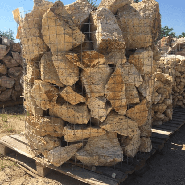 Sárga kő kosaras. 1 db, porózus, kovás, fagyálló dekoratív kőtömbök. Sziklakertek, szökőkutak, parkok díszítéséhez. kb.20×20×20 cm méretű.