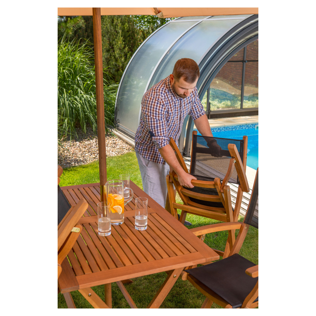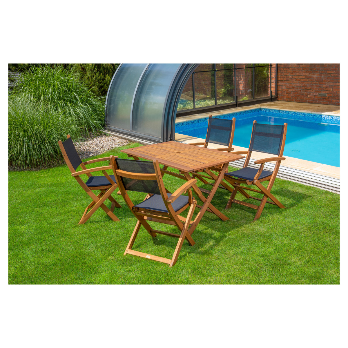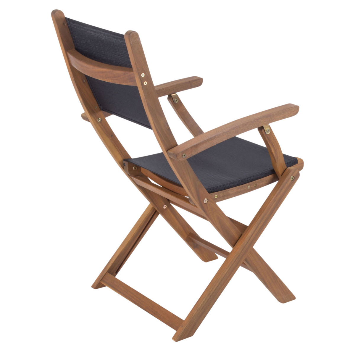 A 54×65×94 cm méretű szék akácfából és impregnált textilből készül, így ellenáll a szélsőséges időjárási körülményeknek, miközben kellemes komfortot nyújt. A háttámlás, karfás kialakítás stabil ülést biztosít, az összecsukható szerkezet pedig helytakarékos tárolást tesz lehetővé.