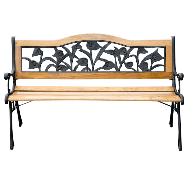 7 léces kerti pad vas háttámlával, kínai keményfa lécekkel tikfából, öntvény lábakkal. Tikfalécek mérete: 122x5,5x1,8cm.