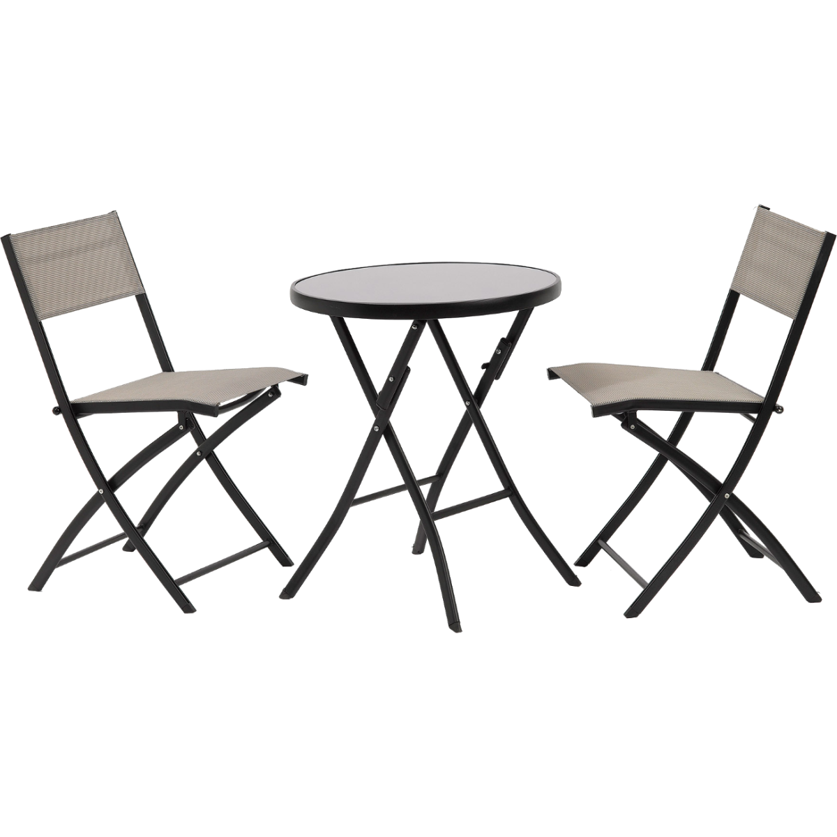 Balkongarnitúra, 2 szék: textilén űlő és hátfelület, 1 asztal : összecsukható 60cm üveglappal.