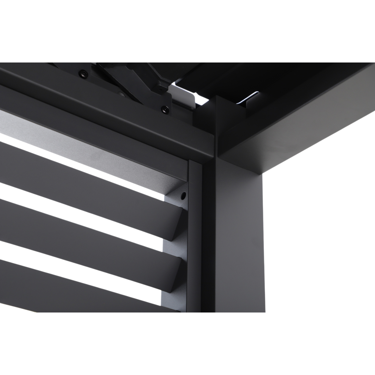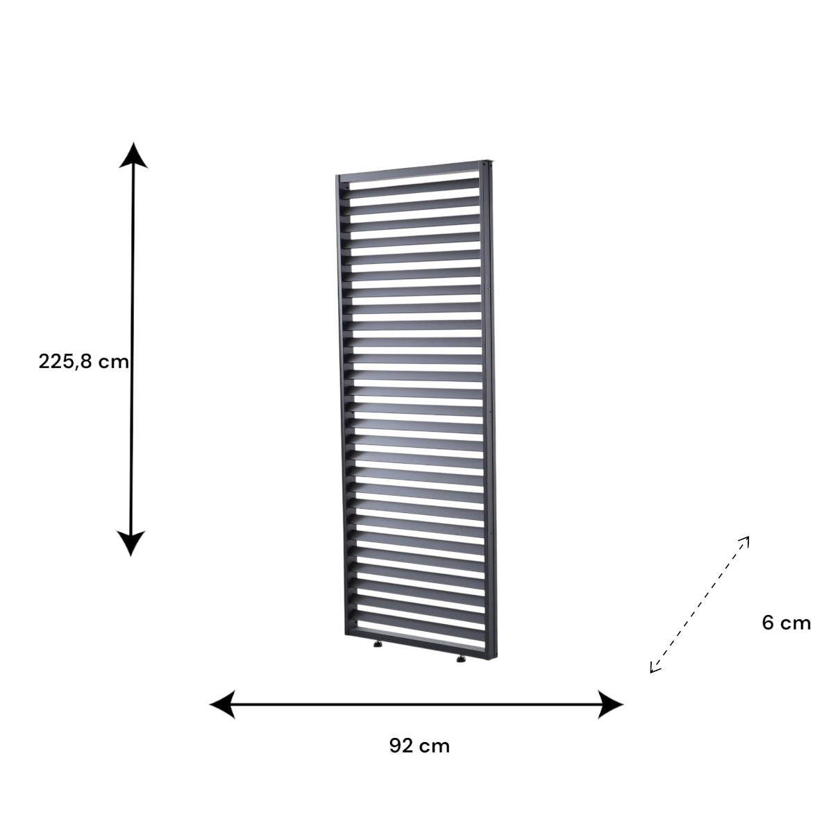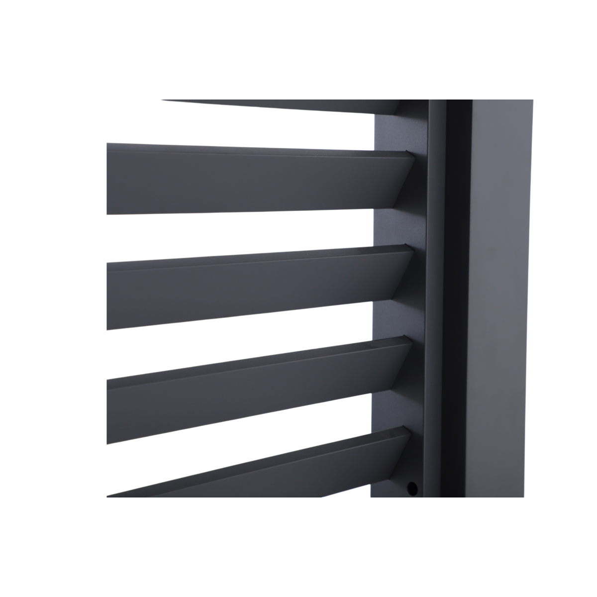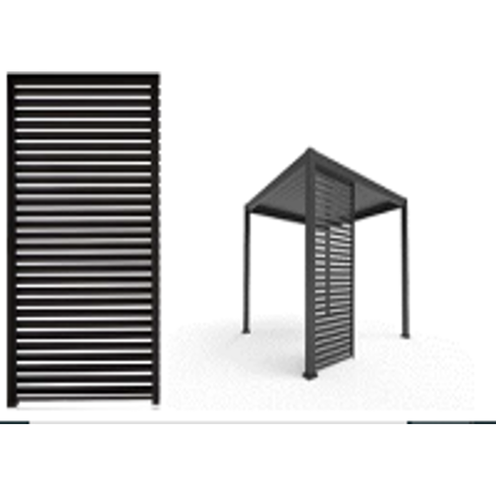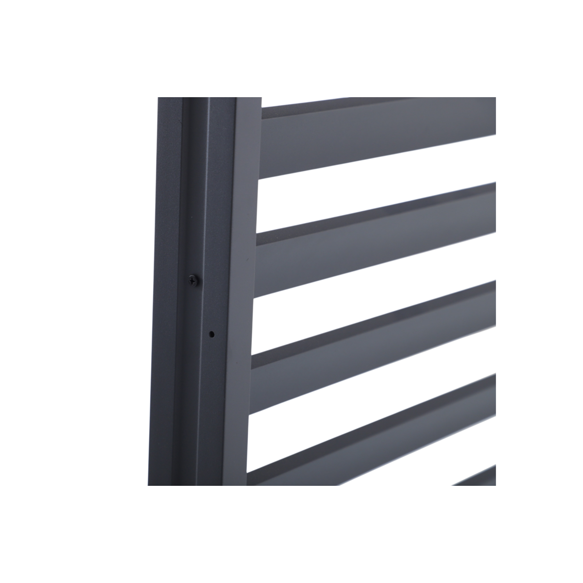 Ez a pavilon oldalfal praktikus kiegészítő kültéri pergolákhoz, amely segít a tér részleges lezárásában és árnyékolásában. A porfestett alumínium keret és az alumínium keresztlécek stabil és tartós szerkezetet biztosítanak kültéri használat mellett.
