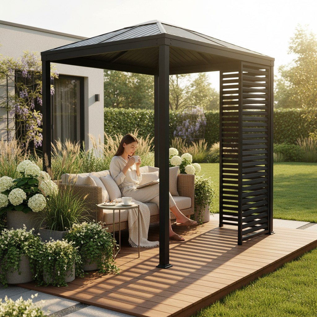 Az oldalfal praktikus megoldást kínál pergolád funkcionalitásának bővítésére, miközben megőrzi annak modern megjelenését.