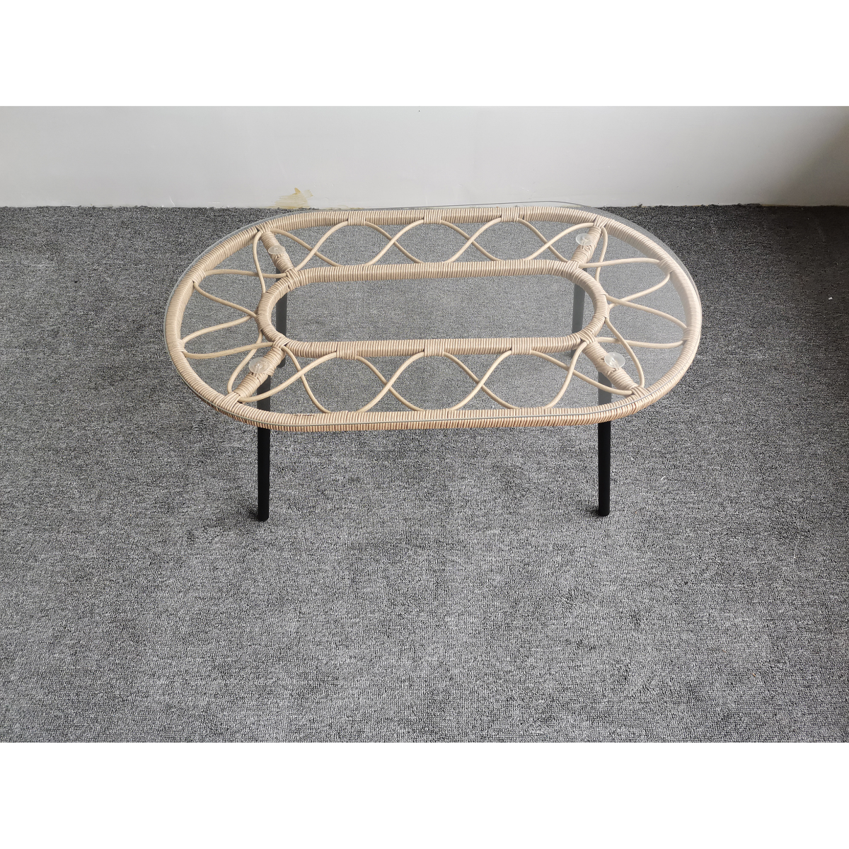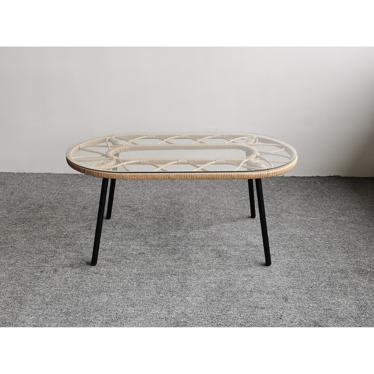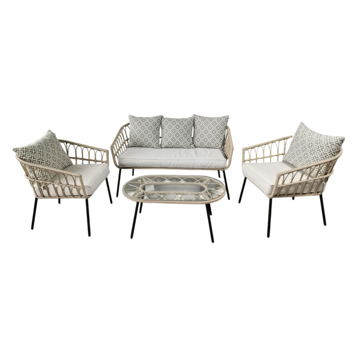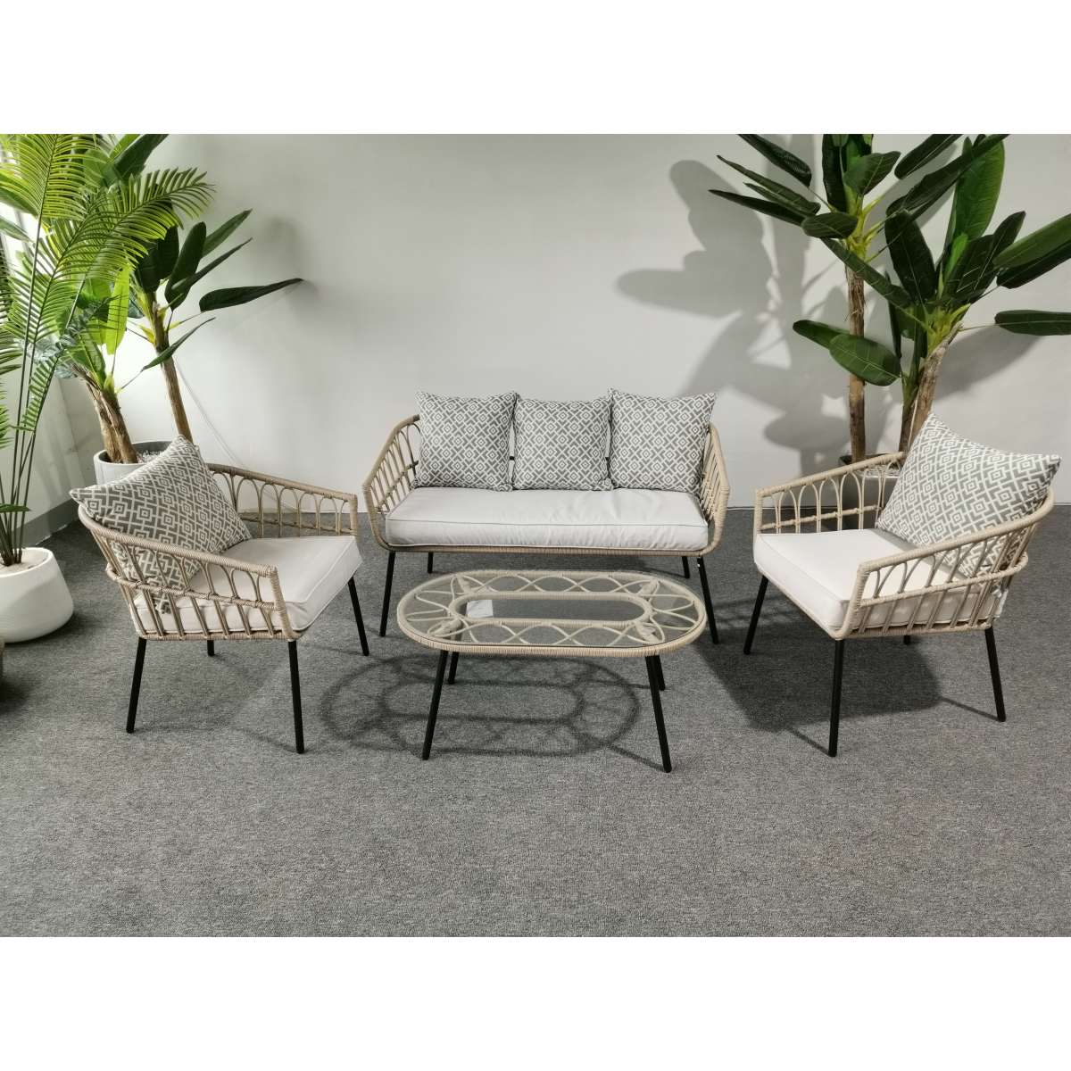 Kerti bútor szett párnákkal; acél váz fonatolt díszítéssel; üveg asztallap.