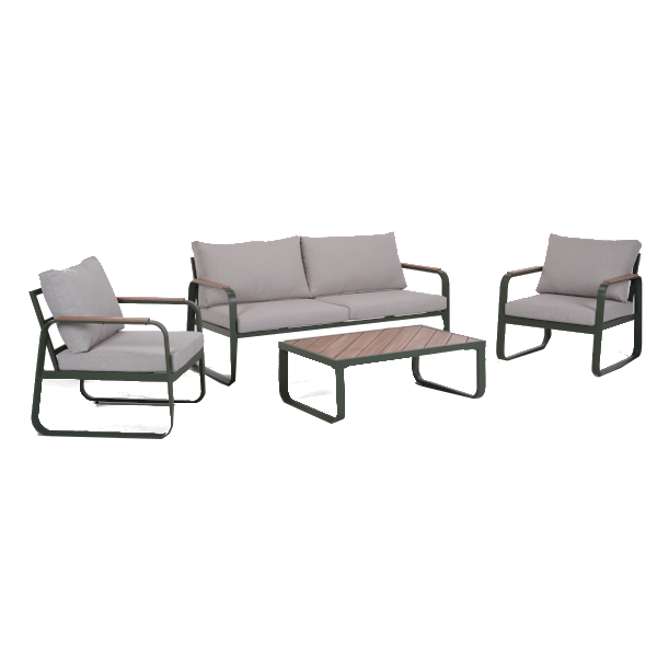 Toulon aluvázas, 4 részes garnitúra, 1 db asztal (Szé) 100 x (Mé) 63 x (Ma) 35,5 cm, 2 db szék (Szé) 73 x ( Mé) 73 x (Ma) 74 cm, 1 db kétszemélyes szófa (Szé) 167 x (Mé) 73 x (Ma) 74 cm.