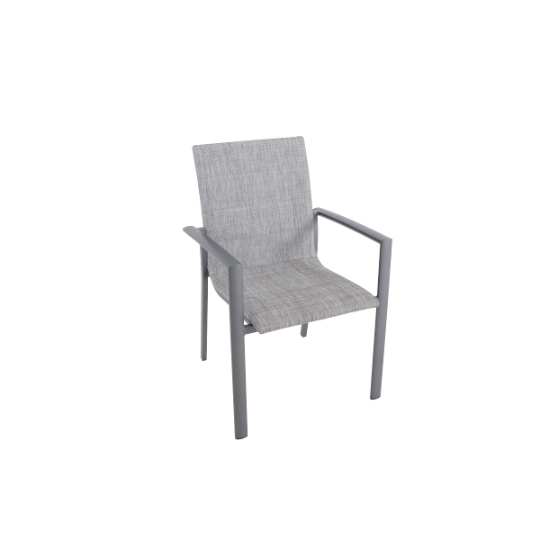 Alumínium kerti szék, párnázott ülő felülettel, szürke színben. Rakásolható. Teherbírás: Max. 110 kg.