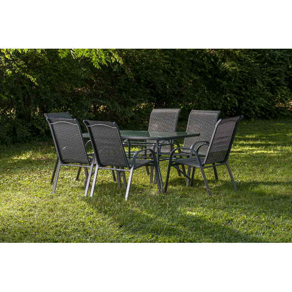 A magas háttámla megfelelő támaszt ad a hátnak, így ideális pihenéshez, étkezéshez vagy beszélgetésekhez. Letisztult, fekete színének köszönhetően könnyen kombinálható különféle kerti asztalokkal és bútorokkal.