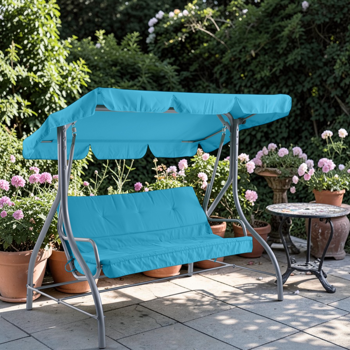 A 3 személyes türkiz párnás hintaágy kényelmes és stabil megoldás, amely kellemes pihenési lehetőséget biztosít a szabadban.