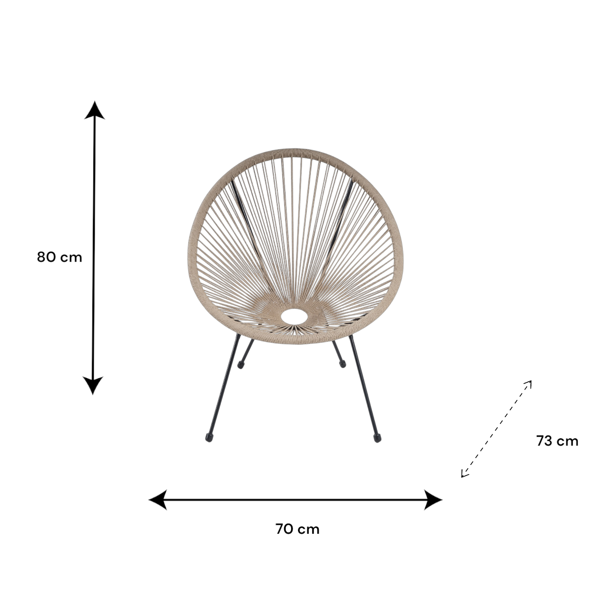 Ez a kényelmes kerti pihenőszék ideális választás teraszra, erkélyre vagy a kert nyugodt pihenősarkaiba. A porfestett acélváz stabil tartást biztosít, míg a műrattan fonatolt díszítés esztétikus, modern megjelenést kölcsönöz a széknek.