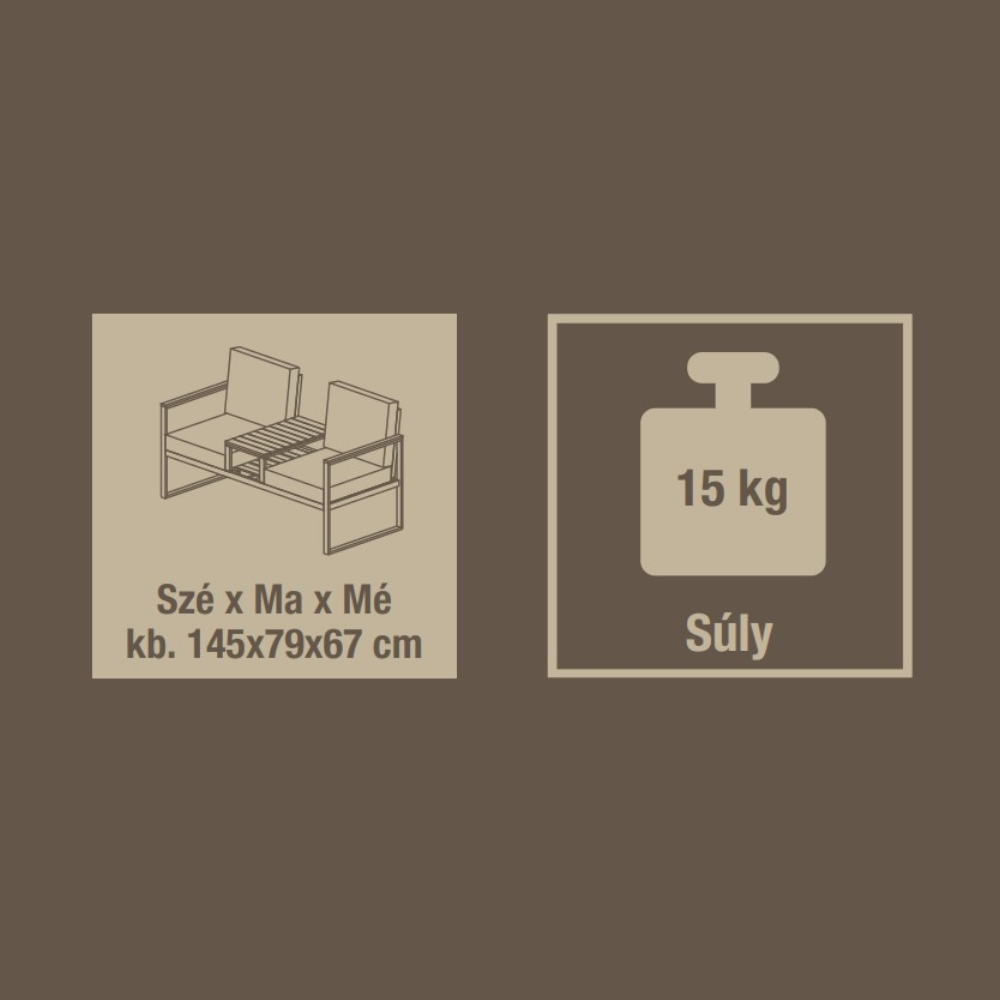 Ez a 2 személyes alumínium társalgó szett ideális megoldás kisebb teraszokra, erkélyekre vagy kerti pihenősarok kialakítására. A porszórt alumínium váz ellenáll bizonyos időjárási viszontagságoknak, míg a természetes hatású polifa felső rész és kartámasz meleg, barátságos megjelenést biztosít. A két ülőfelület között helyezkedik el a dohányzóasztal, mely feldobja kinézetét és különlegessé teszi a szettet.