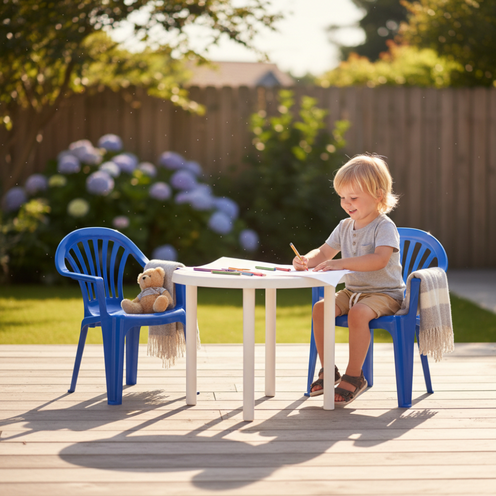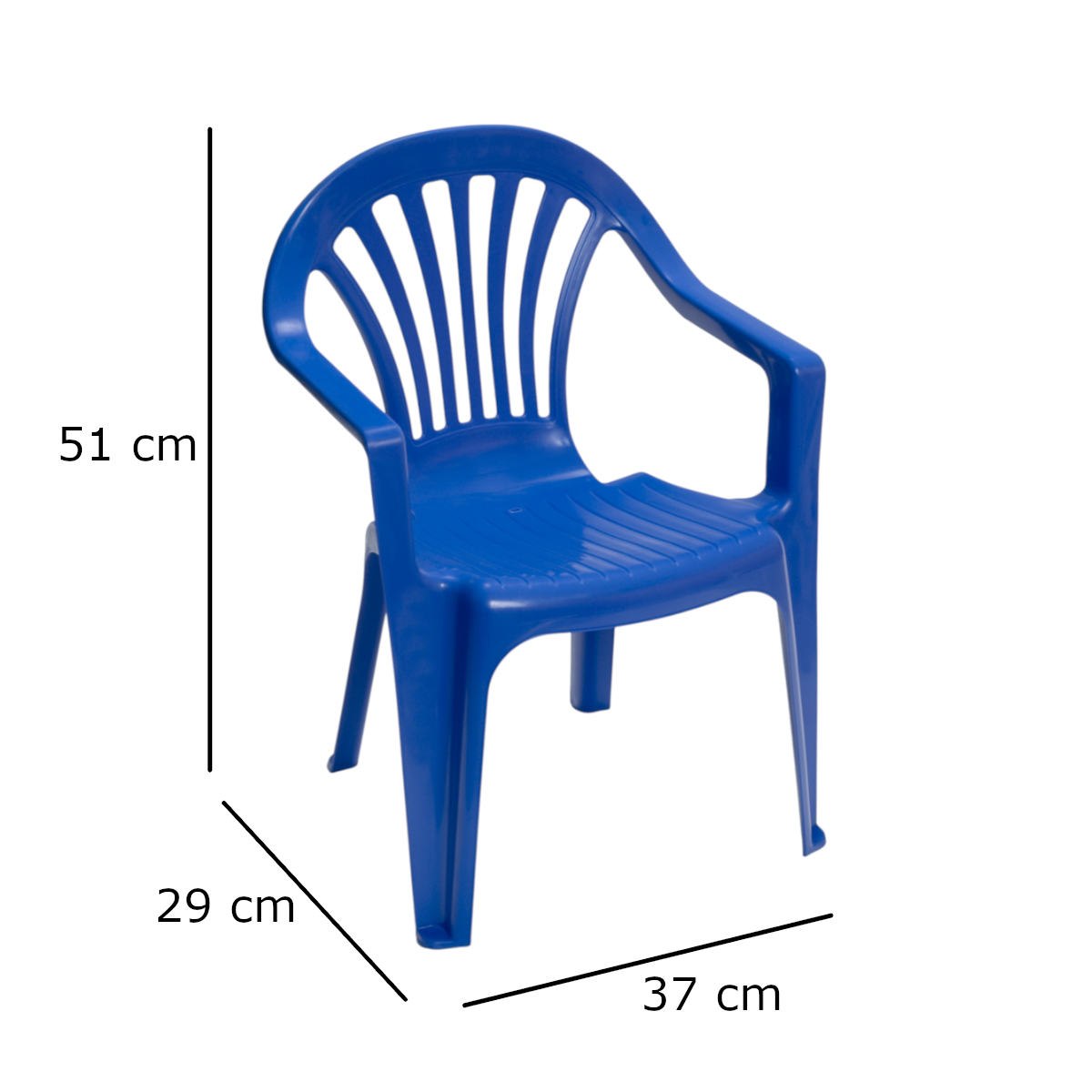 A kartámaszos forma kényelmes ülést biztosít játék, pihenés vagy rajzolás közben. Műanyag anyagának köszönhetően egyszerűen mozgatható, így a gyerekek is könnyen használhatják önállóan. A kék szín vidám megjelenést ad, amely jól illeszkedik kerti és teraszos környezetbe. A felület könnyen tisztítható, ami a mindennapi használat során praktikus előnyt jelent.