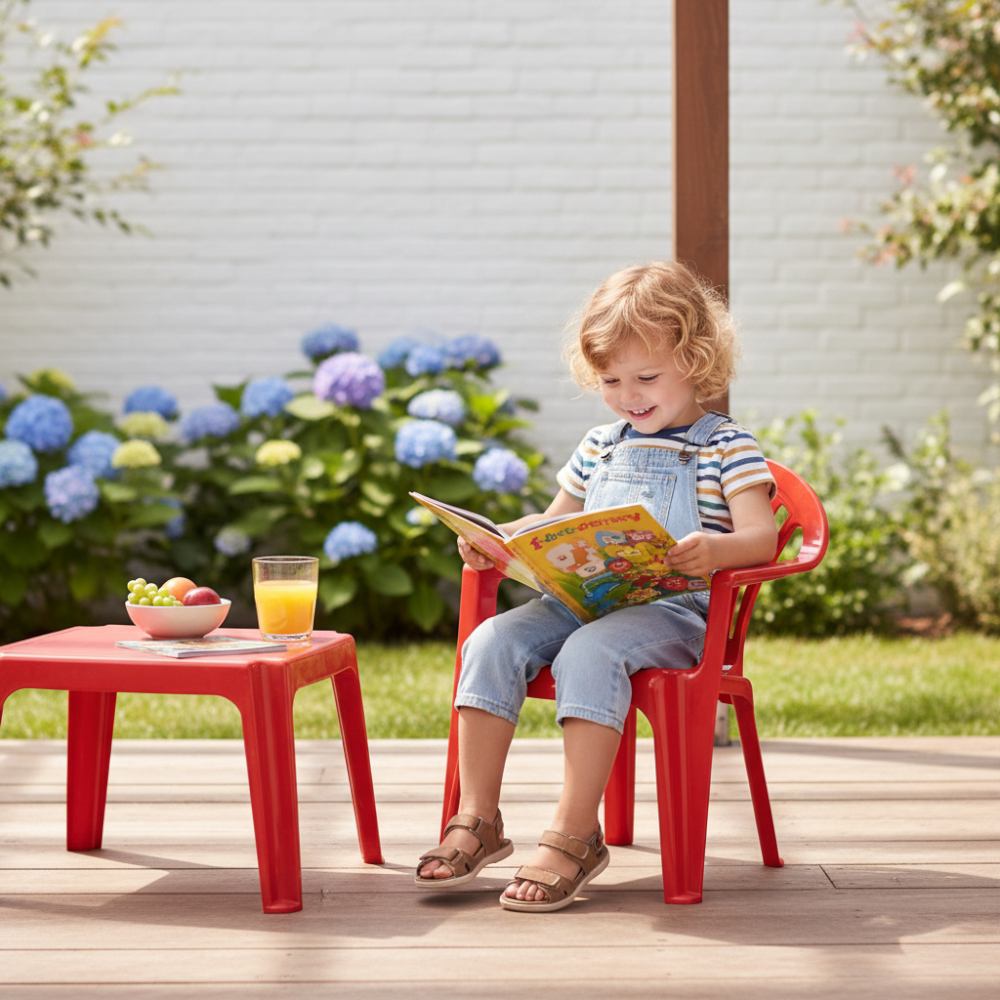 A kartámaszos forma kényelmes ülést biztosít játék, pihenés vagy rajzolás közben. Műanyag anyagának köszönhetően egyszerűen mozgatható, így a gyerekek is könnyen használhatják önállóan. A piros szín vidám megjelenést ad, amely jól illeszkedik kerti és teraszos környezetbe. A felület könnyen tisztítható, ami a mindennapi használat során praktikus előnyt jelent.