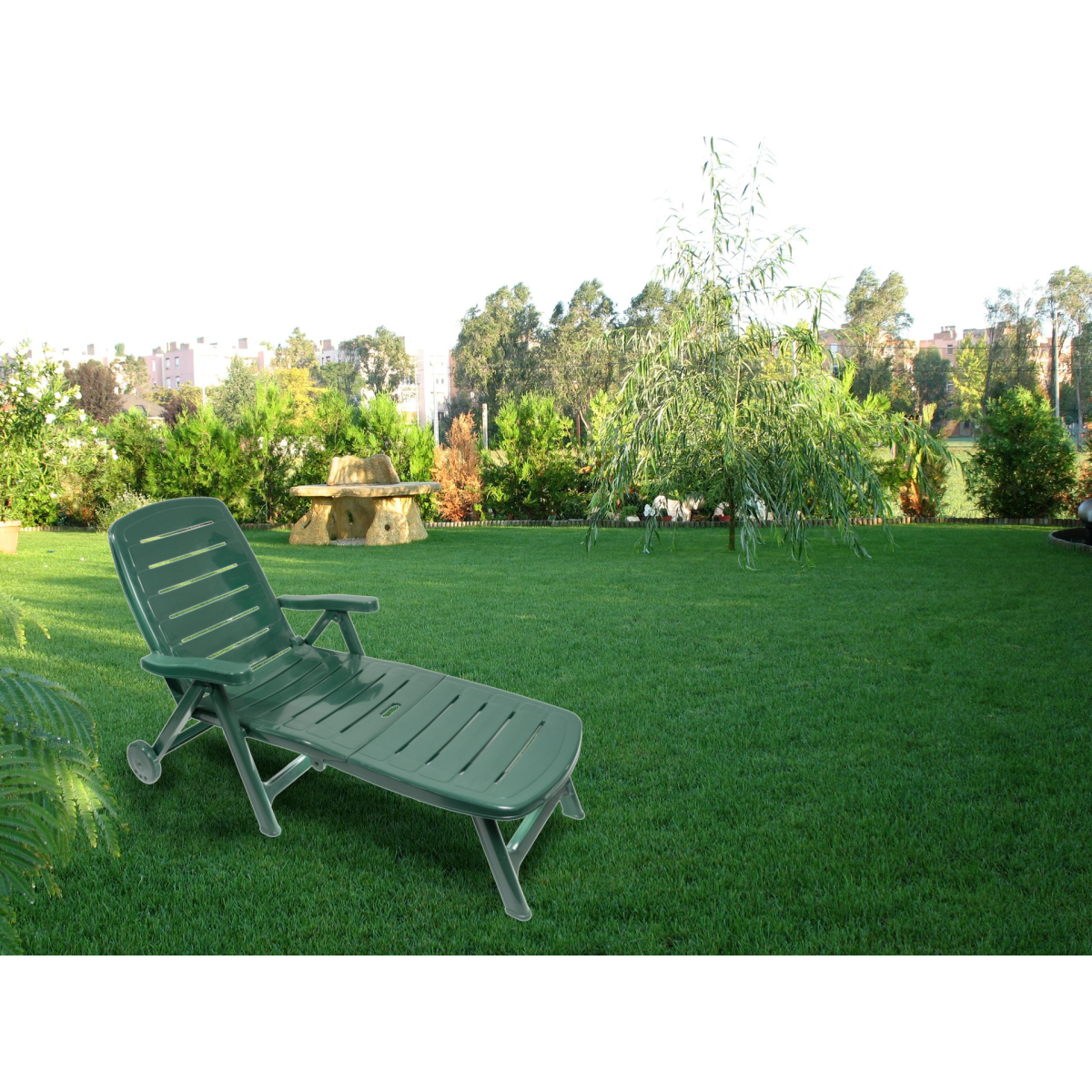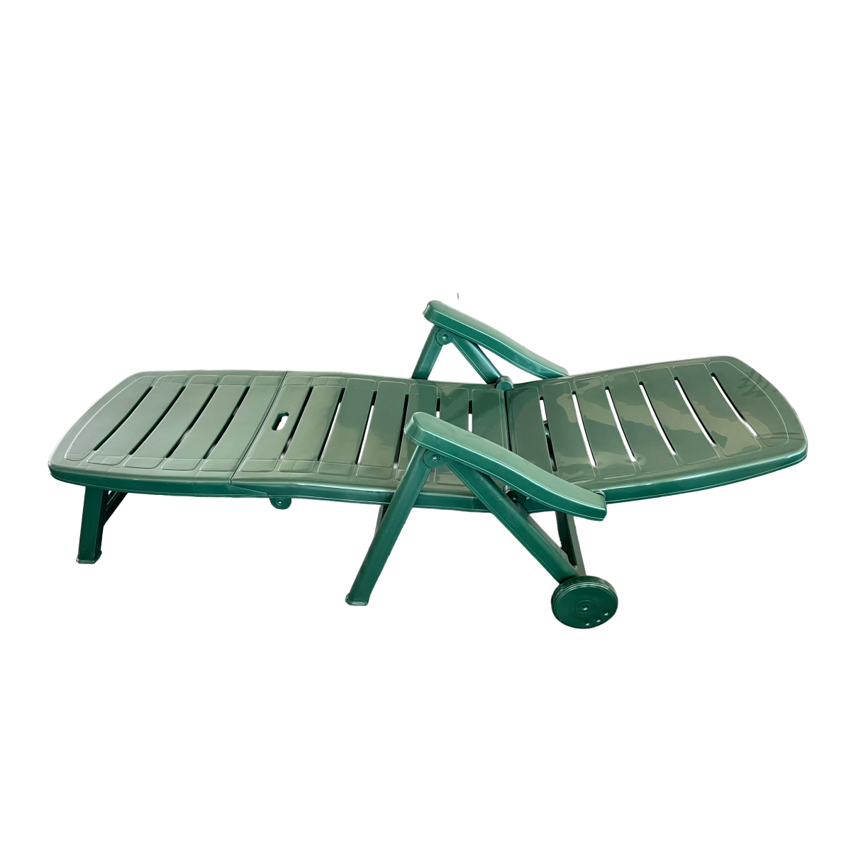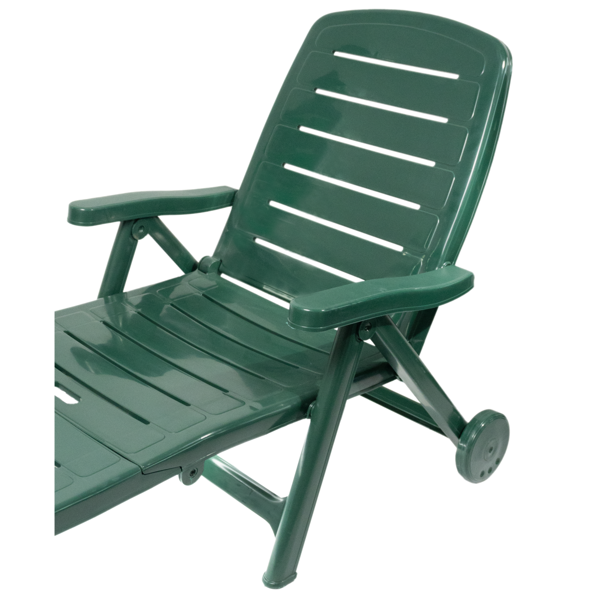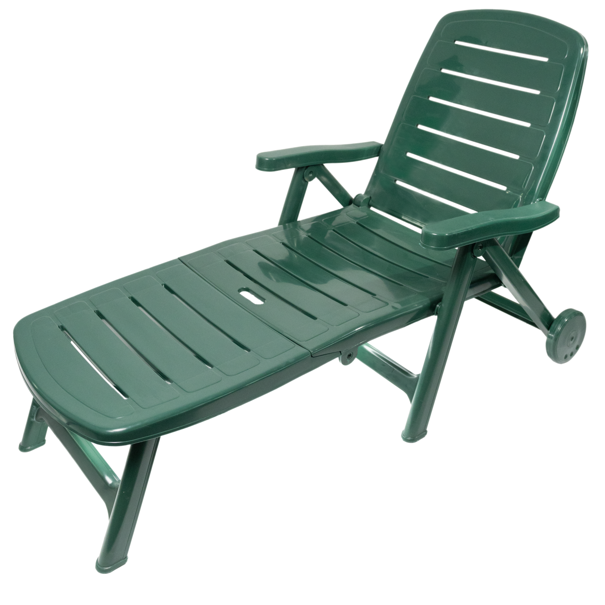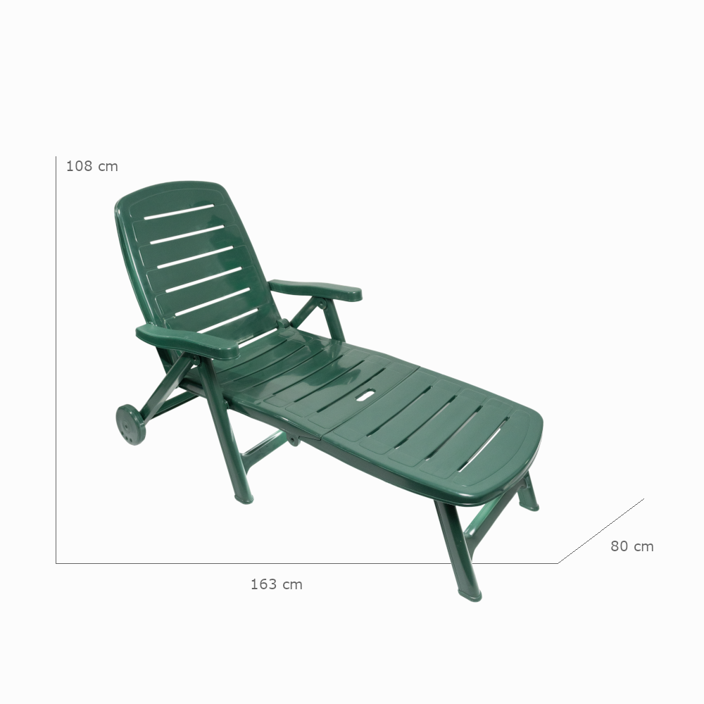 Zöld színű, műanyag napozóágy, összecsukható. Tisztítása karcmentes tisztítószerrel ajánlott. Max. terhelhetőség 110kg. Terhelés alatt mozgatni és emelni tilos! A napozóságyon hintázni tilos, balesetveszélyes! Használata ülőpárnával javasolt. TÜV-GS tanúsított termék.