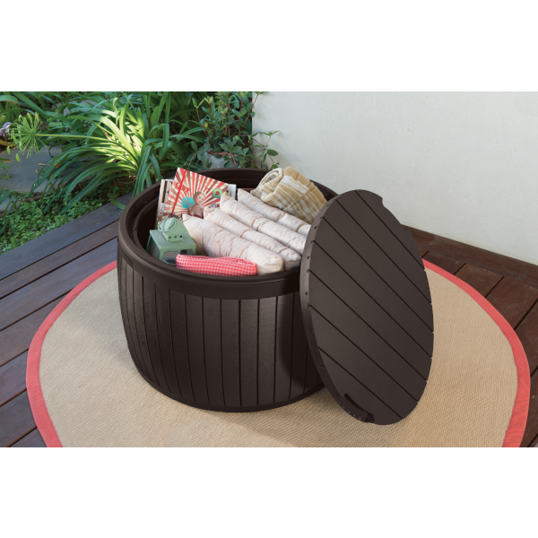 A circa wood 140l tároló modern formatervezése még a legigényesebb felhasználókat is lenyügözi. Ezt a praktikus terméket többek között optimális tárolóképesség, tartós és erős szerkezet, valamint magas minőségű műanyag jellemzi. További hasznos funkcióihoz tartozik a kerek forma, valamint a láda kézreálló dohányzóasztallá alakításának a lehetősége. Összeszerelése egyszerű. Mérete 67,5x67,5x43,5cm. Barna színű.