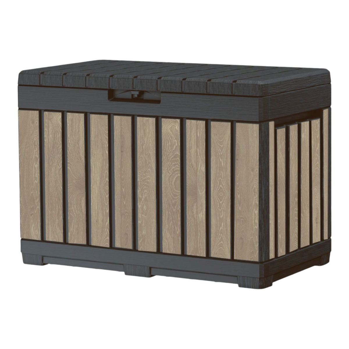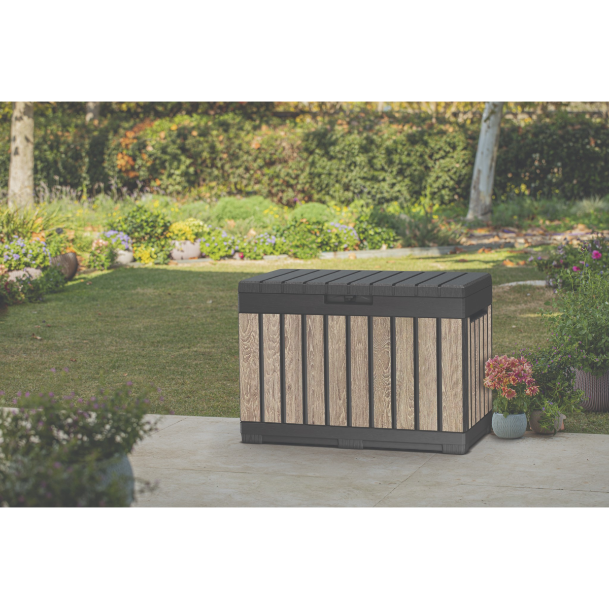 A Kentwood 190 literes kerti tároló praktikus és dekoratív megoldás kerti eszközök, párnák vagy kerti kiegészítők rendszerezett tárolására. A Decocoat kőrisfa hatású felület természetes megjelenést ad a tárolódoboznak, így jól illeszkedik különböző stílusú teraszokhoz és kertekhez.