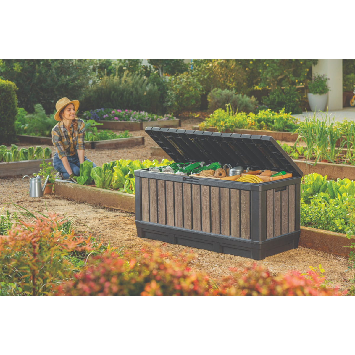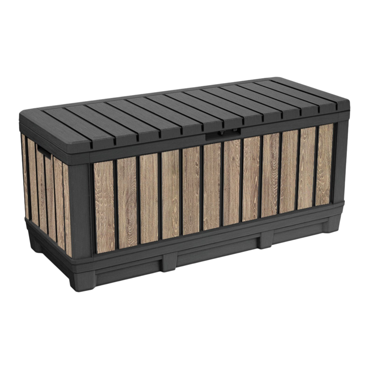 A Kentwood 350 literes kerti tároló praktikus és dekoratív megoldás kerti eszközök, párnák vagy kerti kiegészítők rendszerezett tárolására. A Decocoat kőrisfa hatású felület természetes megjelenést ad a tárolódoboznak, így jól illeszkedik különböző stílusú teraszokhoz és kertekhez.