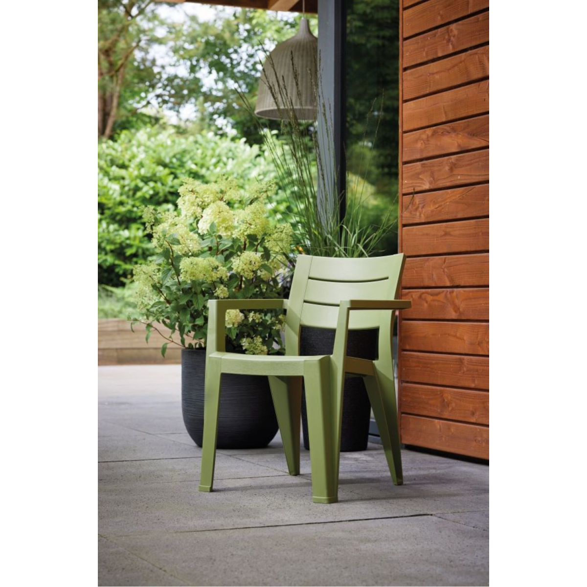 A Keter Julie kerti szék korszerű megjelenésével és visszafogott cédruszöld színével jól illeszkedik modern és klasszikus kerti környezetbe egyaránt.