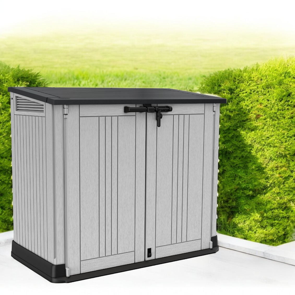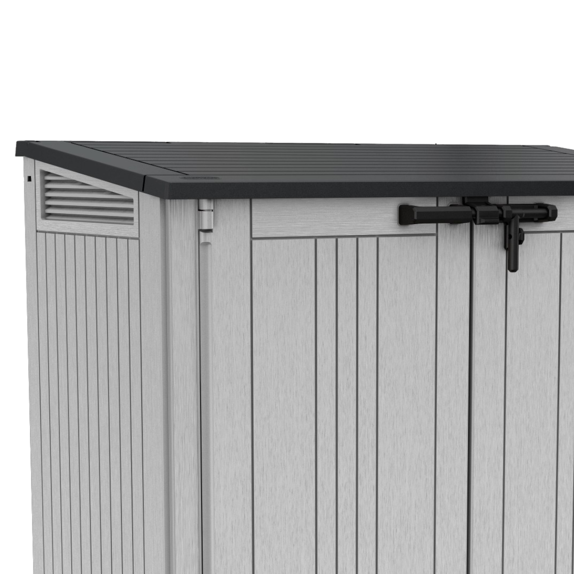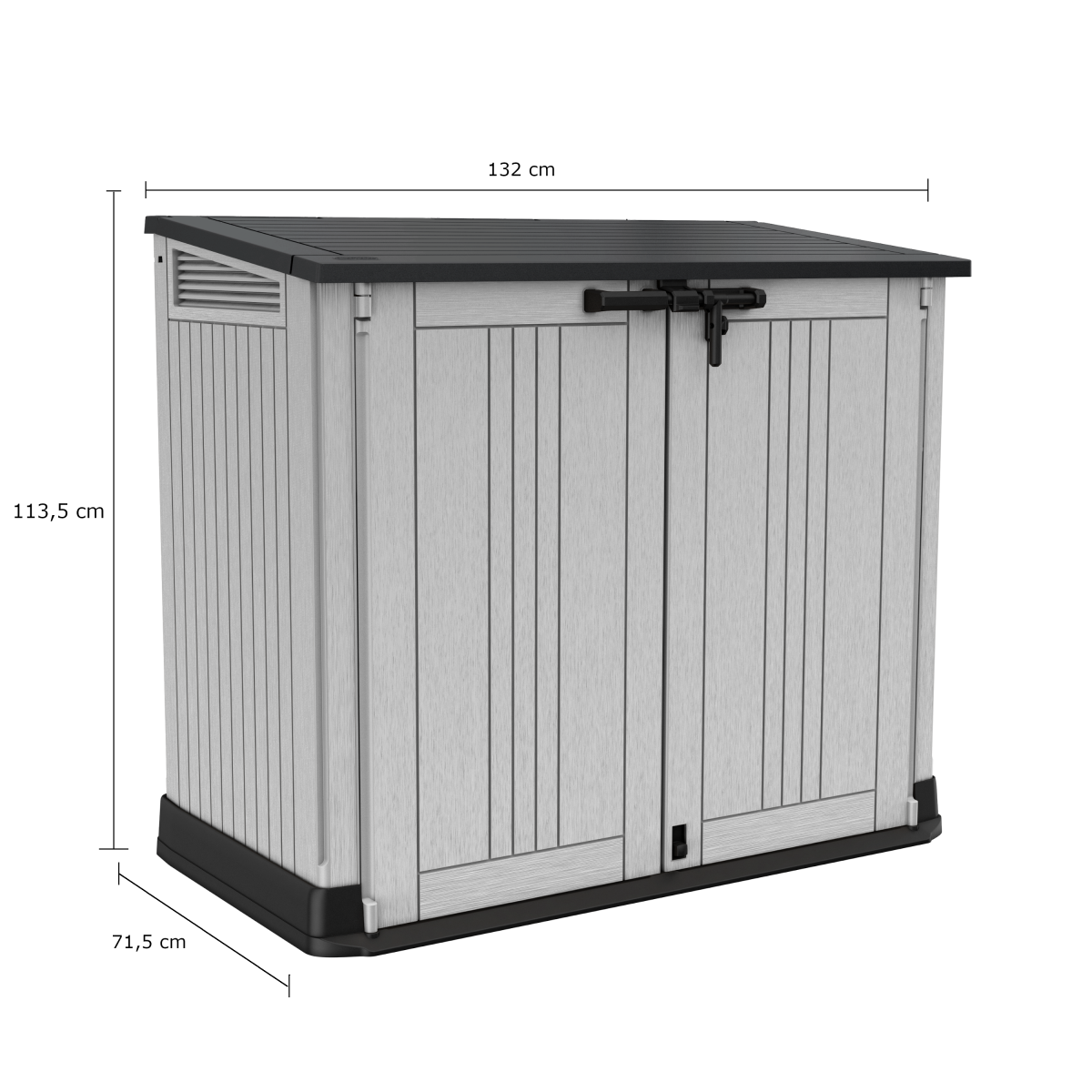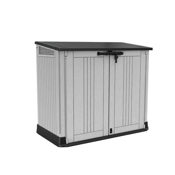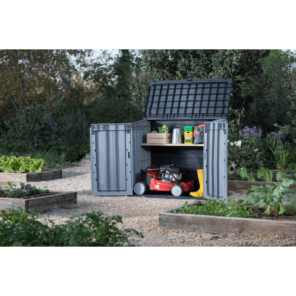 A store-it-out midi tárolót egyszerű és elegáns mintázat, univerzális színválaszték és természetes fára emlékeztető felület jellemzi. Opcionálisan a polcok beszerelése tovább növeli a termék használati tulajdonságait. A tároló minden olyan helyen beválik, ahol nélkülözhetetlen a kerti tartozékok és háztartási tárgyak tárolása. A szolid szerkezet megvédi a tárolóban tárolt tárgyakat a nedvességtől, a magas minőségű nyersanyagok hosszú élettartamot garantálnak.