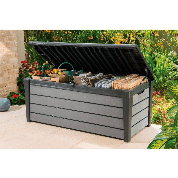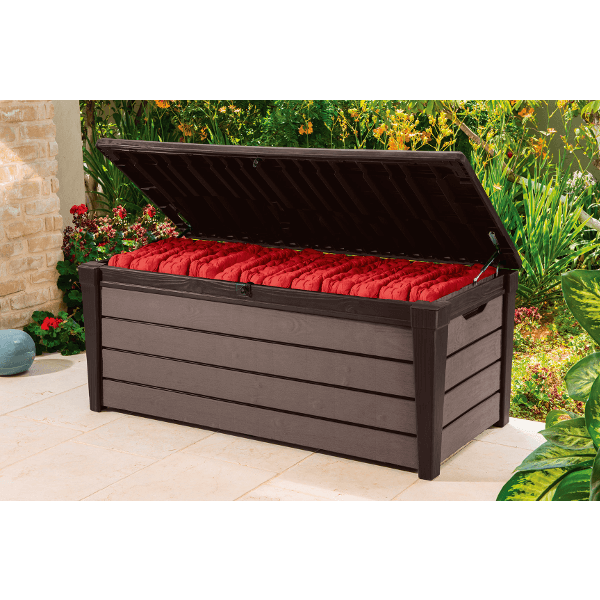 Ebbe a tágas tárolóba, mint amilyen a BRUSH 455 L, nem csak a kézi tartozékok, de a kerti munkálatokhoz elengedhetetlen szerszámok, kerti játékok és szabadidős eszközök is elférnek. Legnagyobb előnye a rendkívül modern, de egyben egyszerű formatervezés és az eredeti jellegű „wood look” felület kialakítás. A láda kinézete hasonlít a természetes fából készült tárolóra. A termék ellenáll a kedvezőtlen időjárási feltételeknek. Könnyű tisztán tartani.