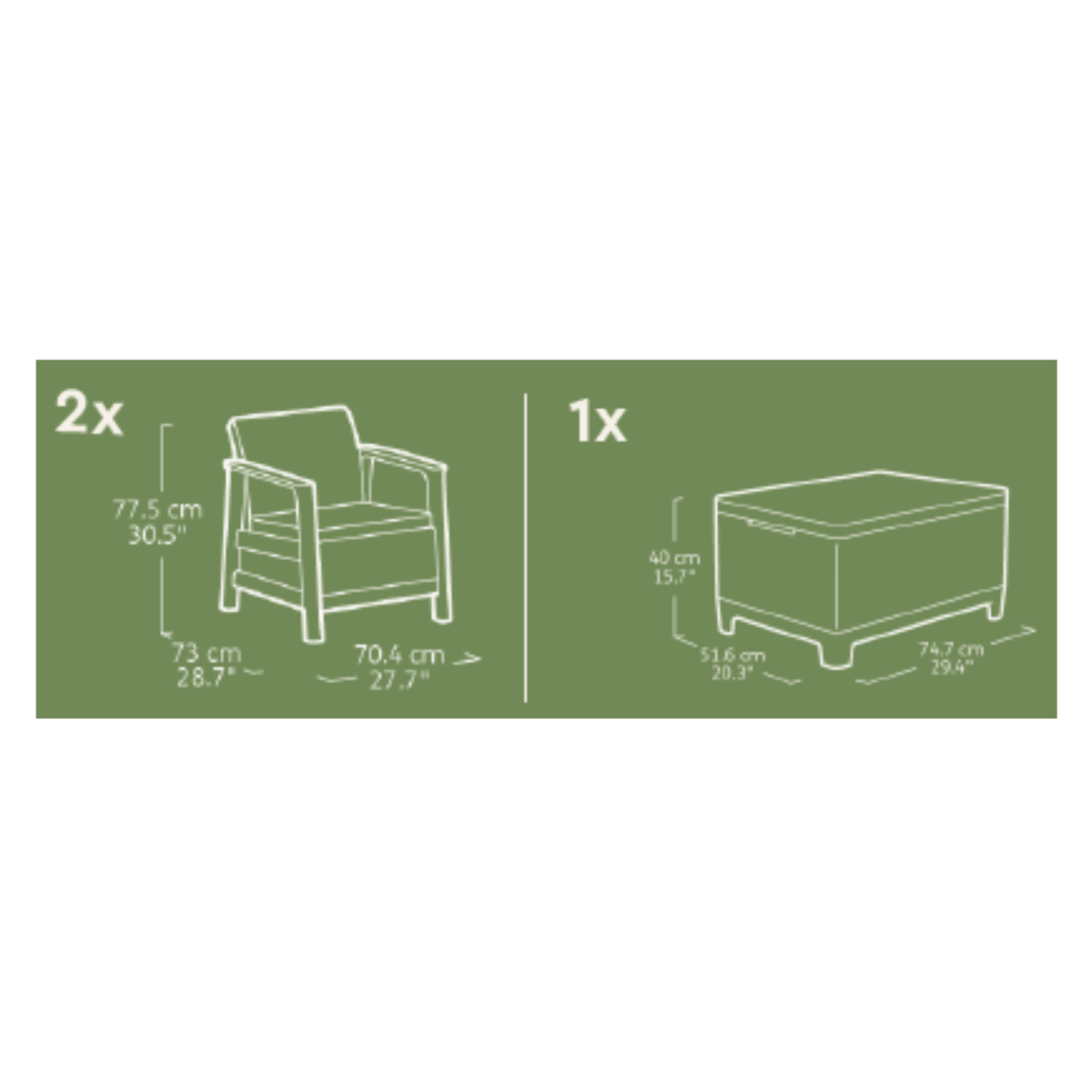 – Összeállítás: 2 fotel + 1 tárolófunkciós asztal