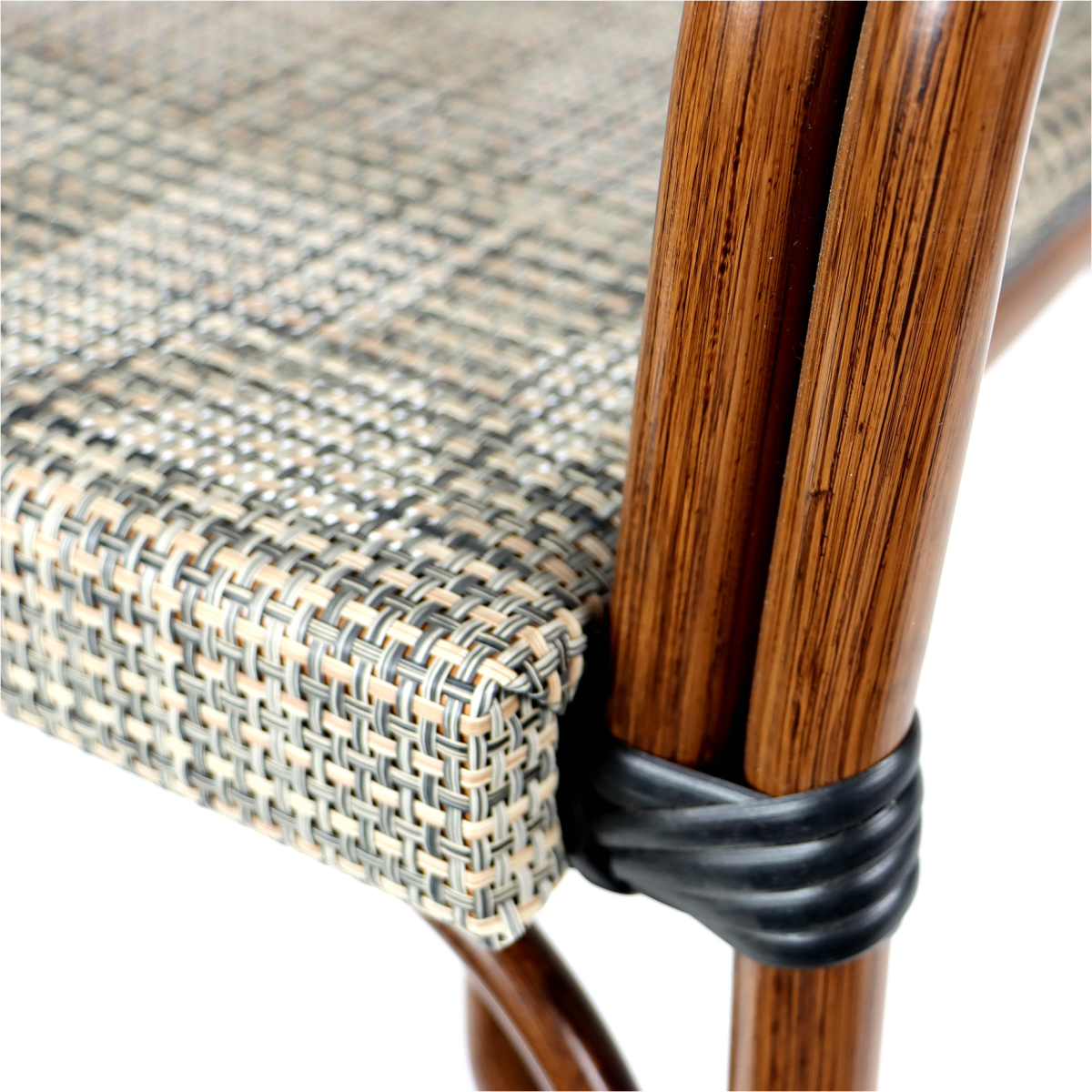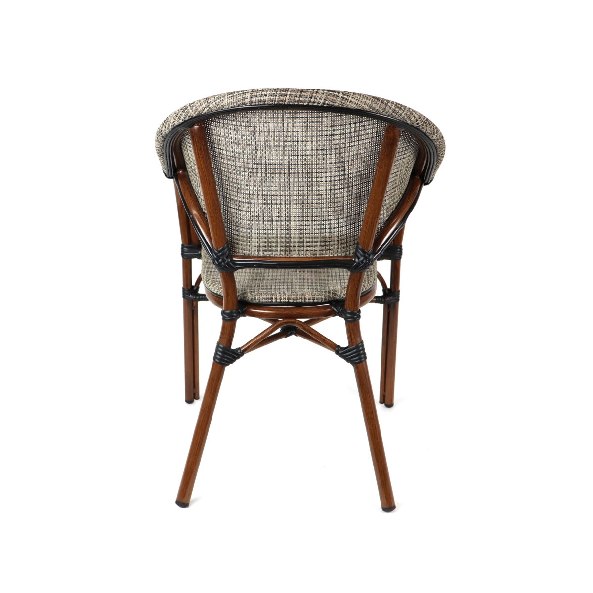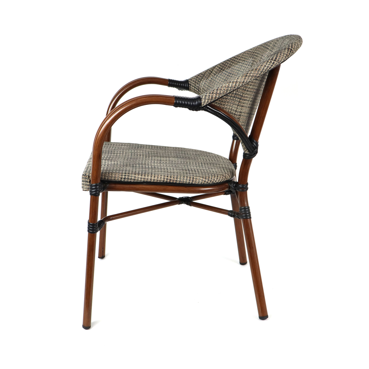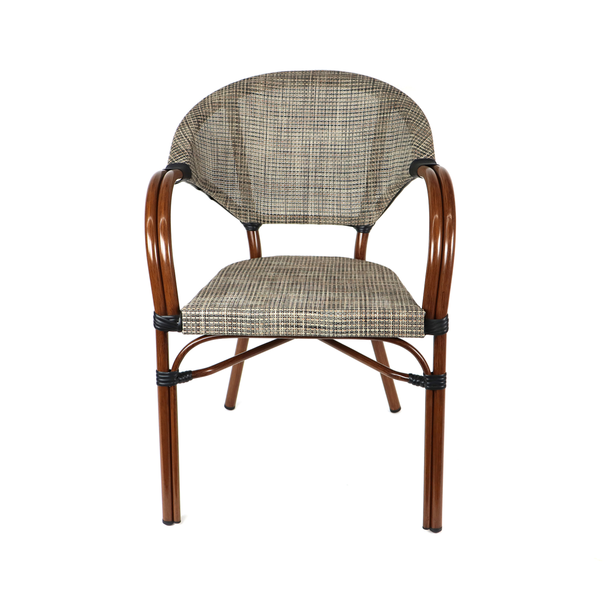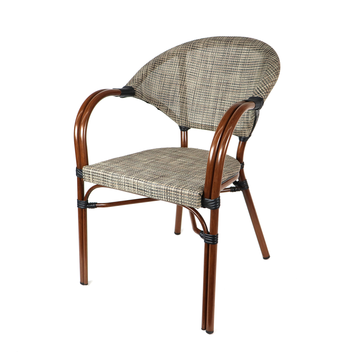 Alumínium szék bambusz hatású lábazattal; textilén szerkezeti anyagai: PVC/PES.
