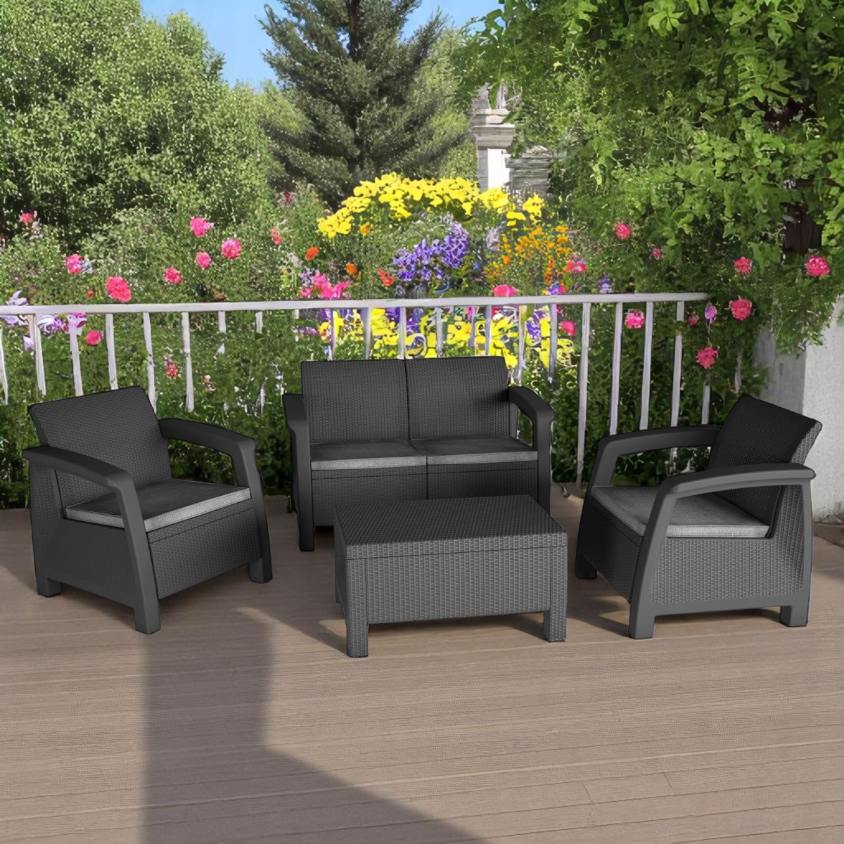 A Bahamas set divatos bútor szett tökéletes alternatívája a Corfu termékvonal hagyományos rattan termékeinek. A szett egy kétszemélyes kanapét, két fotelt és egy asztalt tartalmaz. Jelegzetes tulajdonsága a lapos, profilozott, enyhén lekerekített könyöktámaszok. A magas minőségű alapanyagok és kivitelezés sok évig garantálja a termék használatát. Összeszerelése könnyű, tisztítása egyszerű. Szék (2db) mérete: 75x70x79 cm. Kanapé mérete: 128x70x79 cm. Asztal mérete: 42x77x42cm.