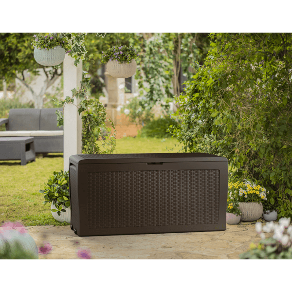 Nagyszerű tároló a párnák és kerti szerszámok számára. A láda műanyagból készült, gyönyörű rattan, esztétikus megjelenés. A beépített fogantyúk és a görgők megkönnyítik a mozgatását. Gyors és egyszerű összeszerelhetőség, nincs szükség szerszámokra. Zárható lakattal (a lakat nem tartozék).