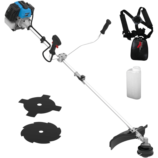 Automatikus centrifugális tengelykapcsoló, kompakt kezelőszervek a fogantyúban, elektronikus gyújtásrendszer, alapozó szivattyú az indítás megkönnyítése érdekében, örvénylapát (8 fogak), csillaglapát (4 fog), menet orsó automatikus gépeléssel, vágási szélességű menetes orsó / kés: 430/255 mm, kényelmes vállpántrendszer, alacsony rezgésű kétkezes többfunkciós fogantyú. Motor kialakítása: 2 ütemű, motor teljesítmény: 1,5 / 2,0 (kW / PS), elmozdulás: 51,7 cm3, tartály térfogata: 1,2 l, keverési arány: 40: 1, motor fordulatszáma:8000/perc, a penge vágási szélessége: 255 mm, menet orsó vágási szélessége: 430 mm, menetátmérő: 2,4 mm. A szál hossza kb.: 280 cm, késlap: 8/4 fog, LWA zajszint: 112 dB, méretek LxWxH: 1800x590x380mm, nettó súly: 9 kg, bruttó súly: 11 kg.